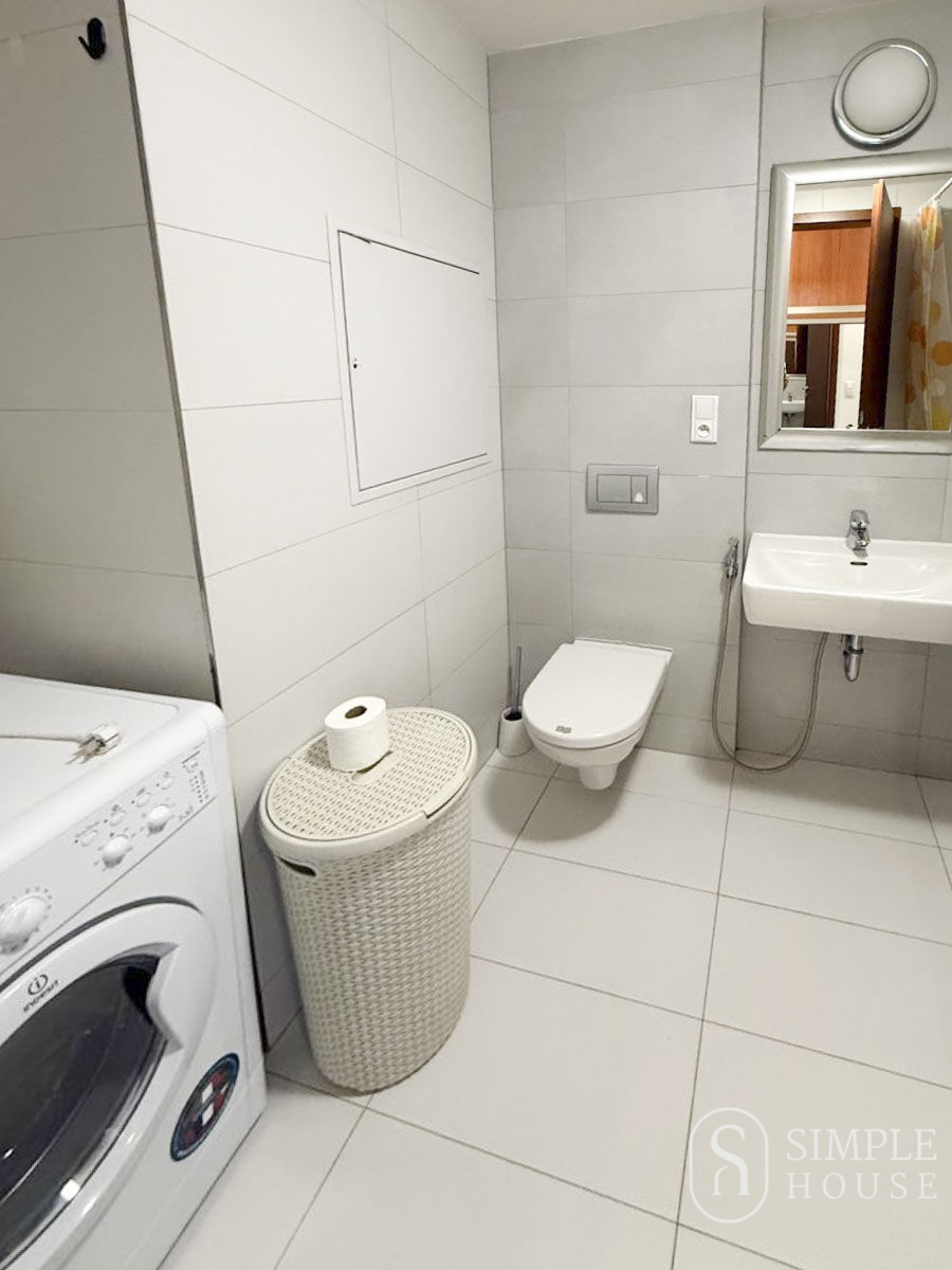 Koupelna je spojena s toaletou a je vybavena vanou a pračkou. V bytě je k dispozici klimatizace, která zajišťuje komfortní bydlení po celý rok. Byt je kompletně vybavený, což umožňuje okamžité nastěhování bez nutnosti dalších investic do zařízení.