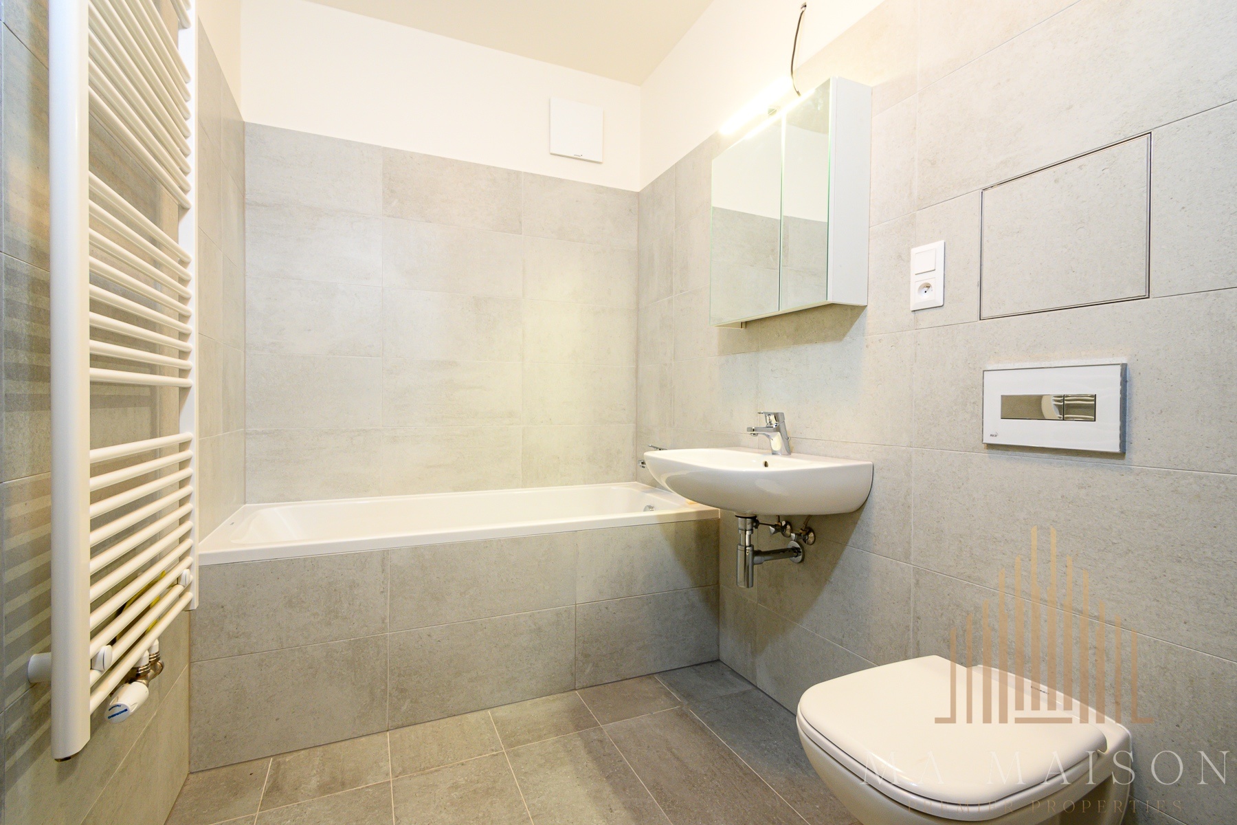 Otopný žebřík a zrcadlo se skříňkou v koupelně, venkovní stahovací žaluzie na elektrické ovládání, stropní svítidla.