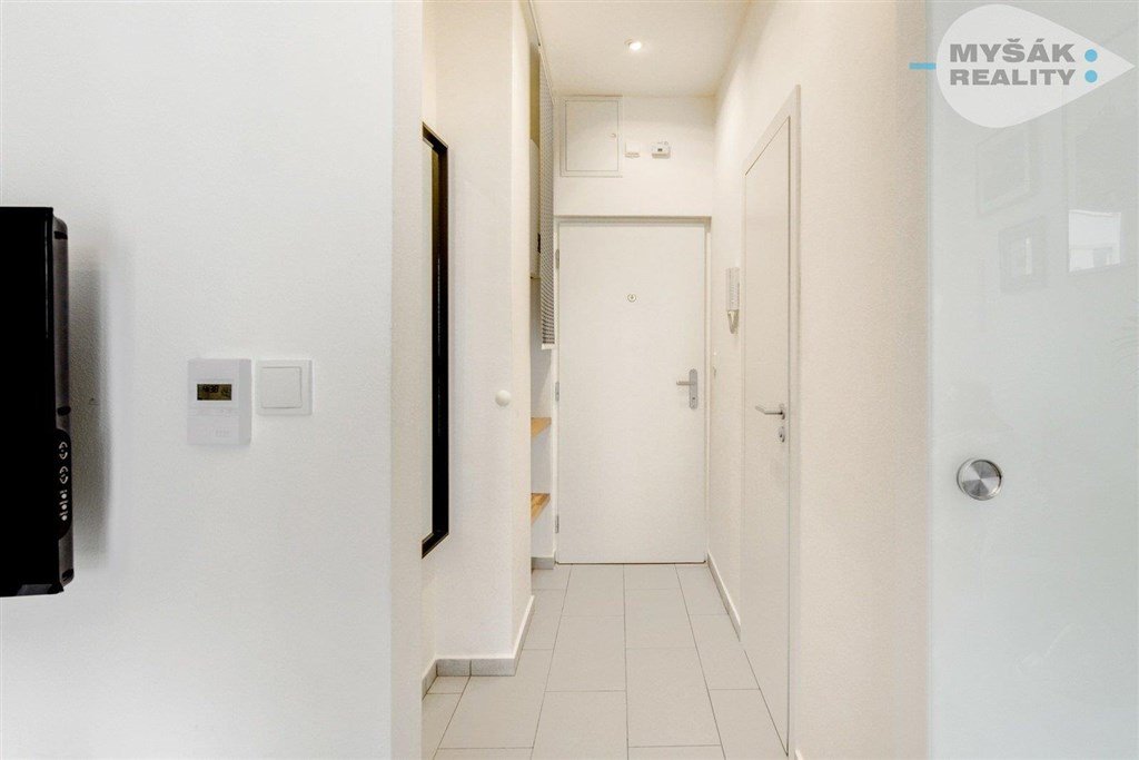 Po vstupu do bytu se nacházíte v chodbě, ze které se dostanete na samostatnou toaletu, dále do koupelny s prostorným sprchovým koutem a velkou dešťovou sprchou. Obývací pokoj má plně vybavenou kuchyni a měří 21m2. Ze spotřebičů zde najdete indukční varnou desku, mikrovlnku s troubou v jednom, lednici s mrazákem, kávovar Nespresso, varnou konvici a toaster. Dále se v obývacím pokoji nachází TV s kabelovým připojením. Velkými francouzskými dveřmi vedou na menší balkon. Po 2 schodech se dostanete do neprůchozí ložnice o rozloze 16m2. Byt je vybaven detektorem kouře a detektorem CO2. Dobré úložné prostory nabízí technická místnůstka, která je vybavena pračkou se sušičkou.