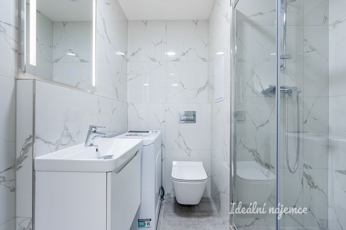 V koupelně se nachází sprchový kout, umyvadlo, koupelnová skříňka, zrcadlo, pračka a WC.