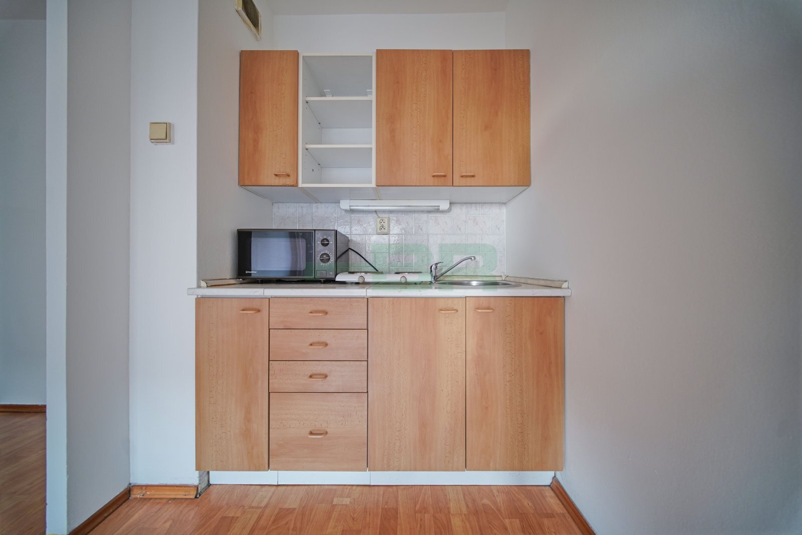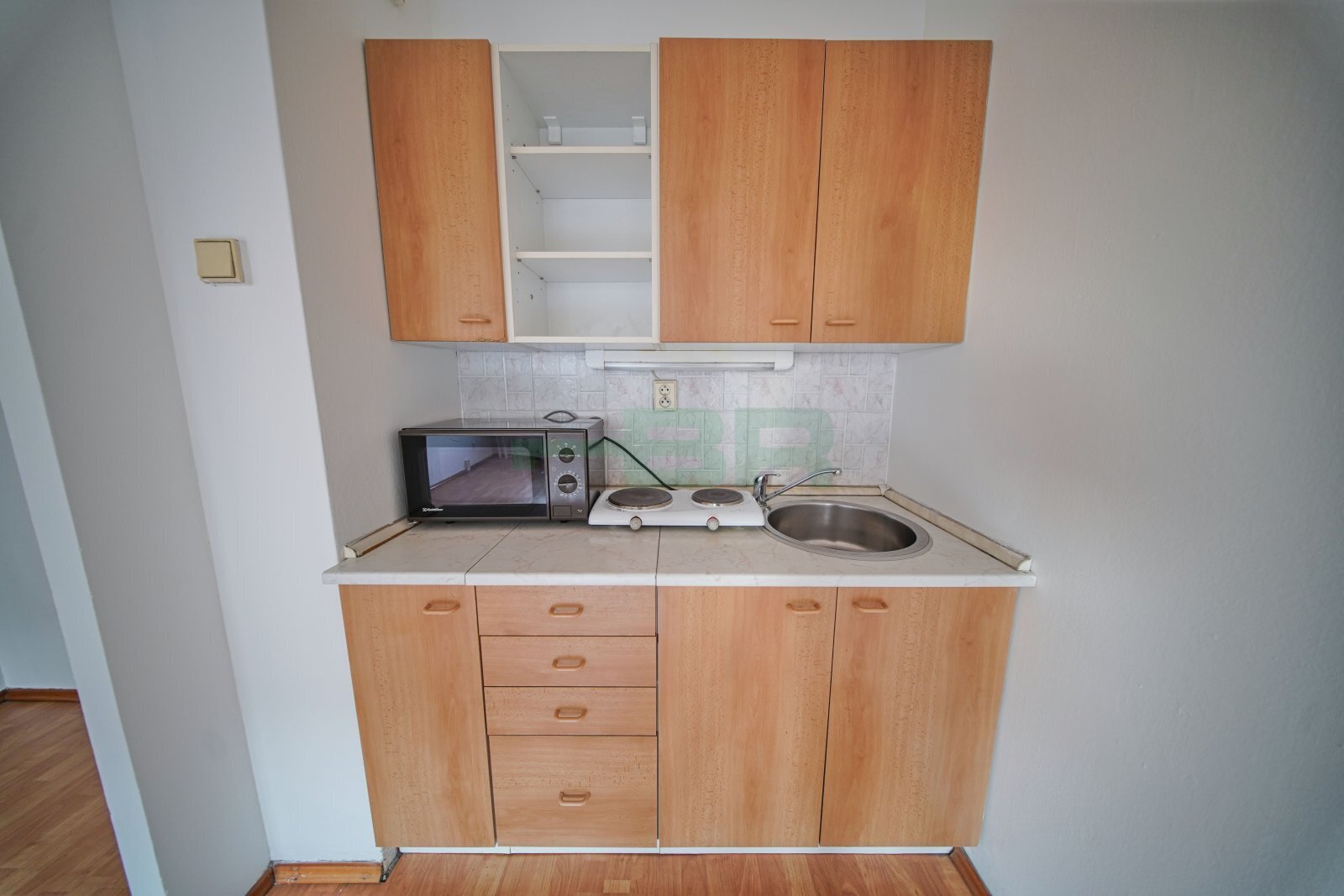 Dvě šatní skříně v předsíni + samostatná komora s policemi. Kuchyňská linka s mikrovlnkou a elektrickou dvouplotnou.