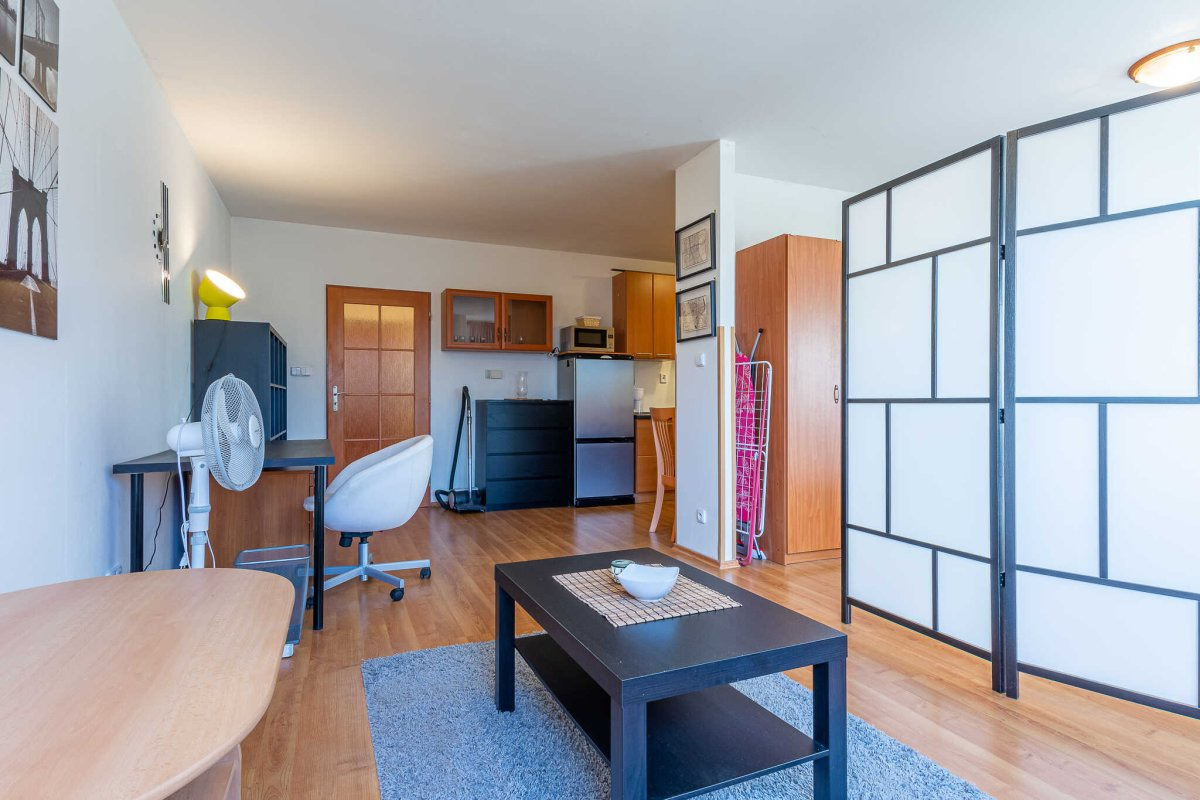 Byt se nabízí vybavený. Kuchyňská linka disponuje lednicí, elektrickou troubou, mikrovlnnou troubou, sklokeramickou deskou a digestoří. V kuchyni je i jídelní stůl s židlemi a komoda. Obývací část je útulně zařízená pracovním stolem s židlí, konferenčním stolkem a za praktickou zástěnou najdeme postel a šatní skříň. Součástí koupelny je vana a umyvadlo. Toaleta je oddělená.