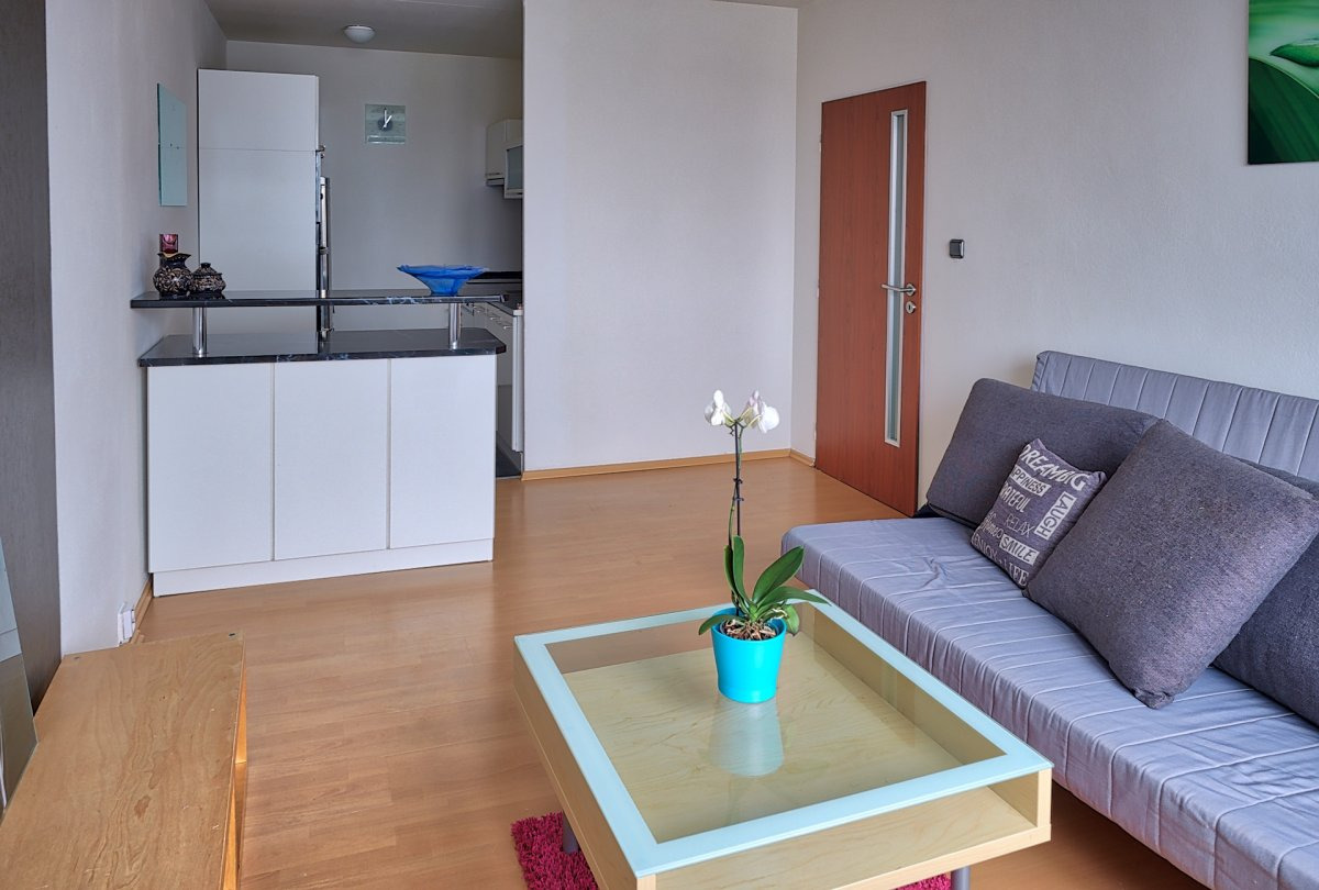 Jedná se o plně zařízený byt, který zahrnuje možnost využít sklepní kóji. Obývací pokoj s kuchyní je vybaven kuchyňskou linku se sklokeramickou varnou deskou, troubou, myčkou, mikrovlnou troubou, lednicí, sedací soupravou, konferenčním stolkem, obývací stěnou.
