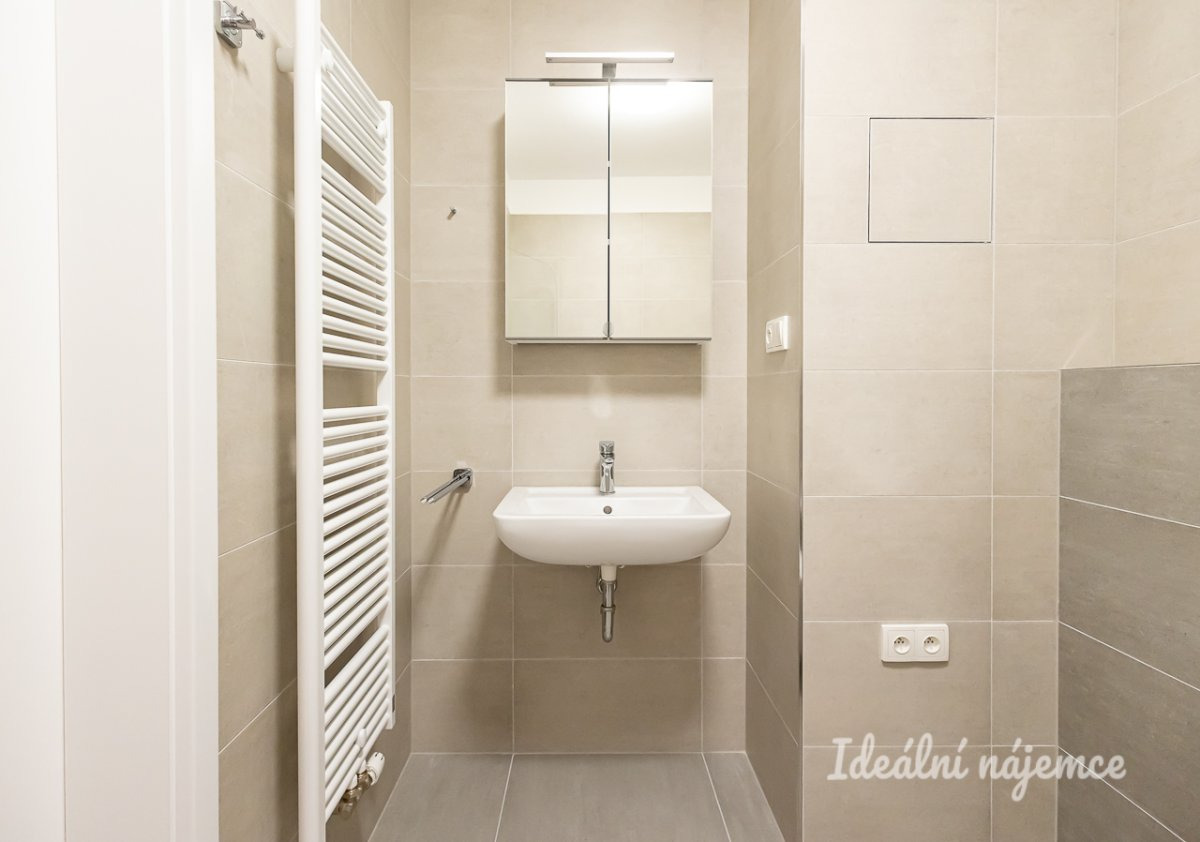 Z prostorné předsíně s velkým nástěnným zrcadlem je vstup do nadčasové koupelny s vanou, závěsnou toaletou a přípojkou pro pračku.