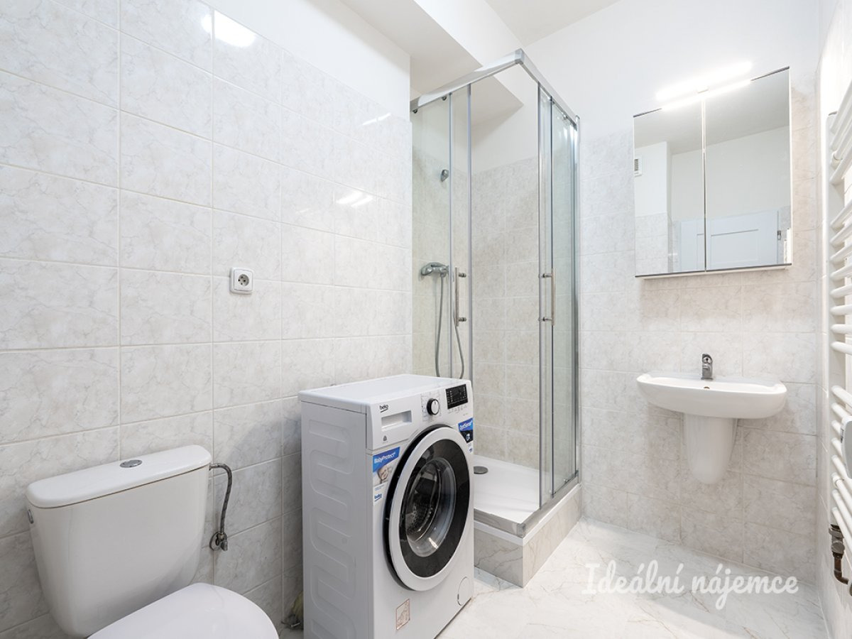 Koupelna je vybavena novým sprchovým koutem, umyvadlem a toaletou. V koupelně je také pračka.
