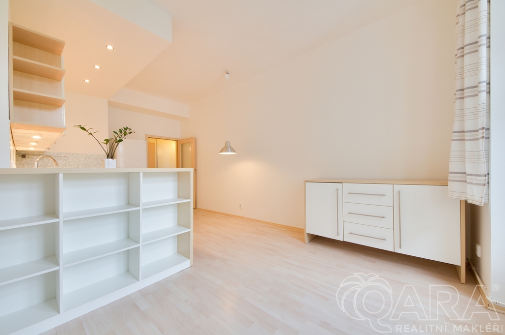 Byt je částečně vybavený a nachází se ve 4. NP s výtahem (v mezipatře) a s okny orientovanými do klidného zeleného vnitrobloku, což zajišťuje dostatek soukromí a ticha. Dispozice bytu zahrnuje obývací pokoj s kuchyňským koutem, samostatnou ložnici a koupelnu s WC. Součástí vybavení je kuchyňská linka se spotřebiči včetně myčky na nádobí, pračka se sušičkou, vestavná skříň v předsíni a šatní skříň v ložnici. Topení zajišťují plynové vafky. Internet od UPC. Byt je vhodný pro jednotlivce nebo pár. Byt je k dispozici ihned.