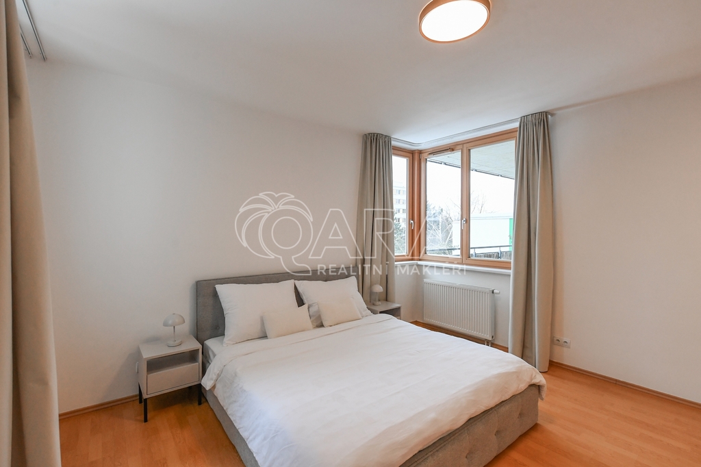 Byt o celkové výměře 82,63 m² (vnitřní plocha – 71,23 m², lodžie – 7,95 m²) je velice dobře dispozičně řešen a tvoří jej: obývací pokoj s kuchyňským koutem a lodžií, velkorysá ložnice jejíž součástí je otevřená šatna, předsíň, samostatné WC a koupelna se sprchovým koutem. V obytných místnostech je položena plovoucí podlaha, v koupelně, předsíni a na WC je dlažba. Orientace oken je na západ. Byt se pronajímá víceméně kompletně viz fotografie. Vytápění domu je dálkové. Dům je vybaven výtahem. K bytu dále náleží komora (3,45 m²) umístěná na patře. V případě zájmu je možnost pronájmu garážového stání.