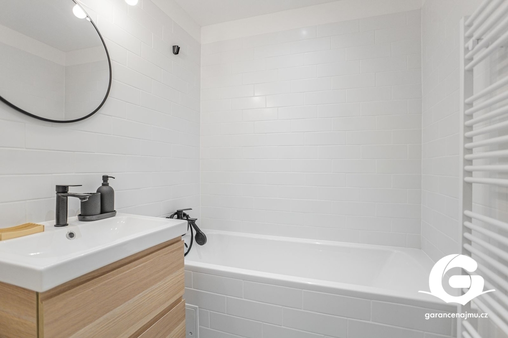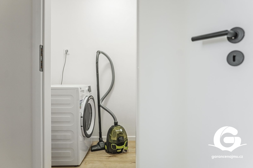 Byt je kompletně zařízen – kuchyň s troubou, digestoří, myčkou, sklokeramickou deskou a lednicí, jídelní stůl se židlemi, pohovka, postel s matrací, pračka, vestavěné skříně v koupelně i na chodbě.