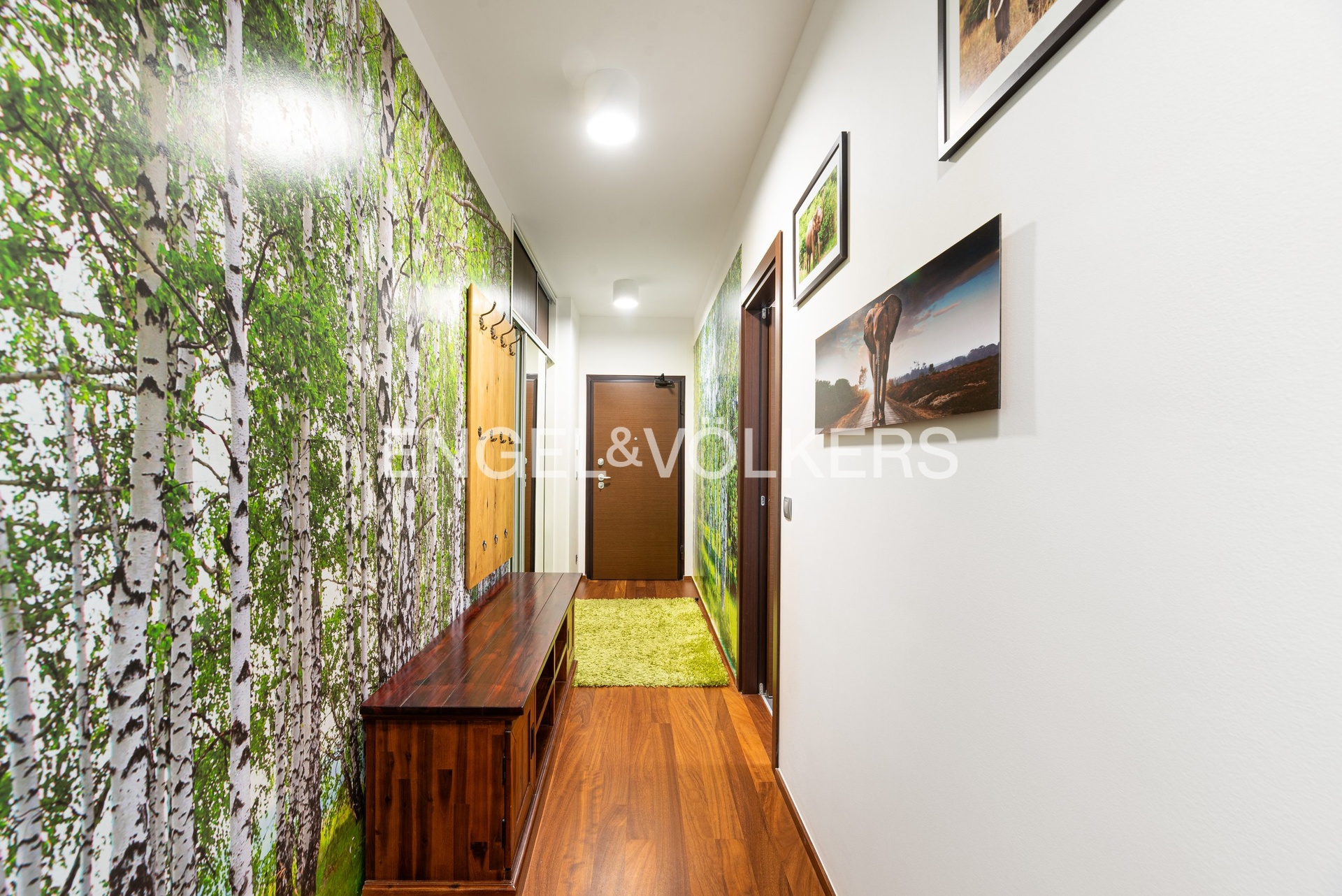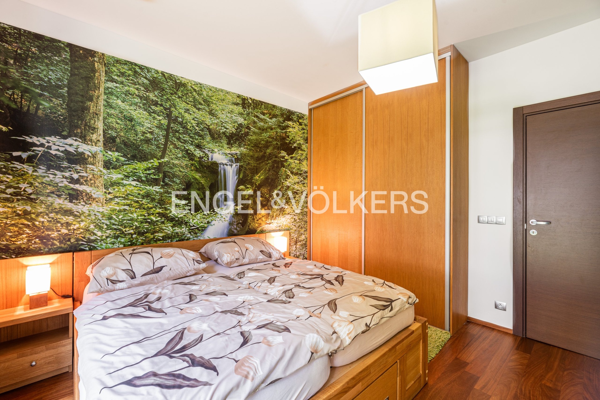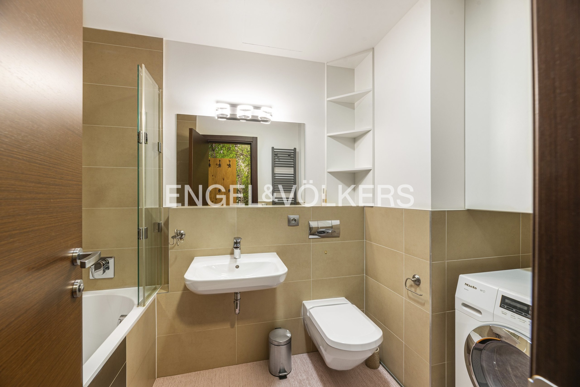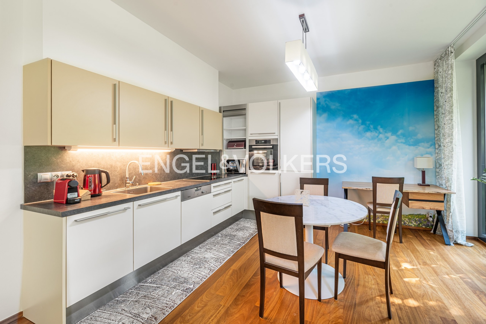 Byt je vybaven moderní kuchyňskou linkou se spotřebiči MIELE (indukční varná deska, horkovzdušná trouba, myčka nádobí, lednice s mrazákem). Interiér zahrnuje kvalitní nábytek (viz fotografie), TV, klimatizaci a vestavěné skříně. Podlahy jsou řešeny kombinací dřevěné podlahy a velkoformátových dlažeb.