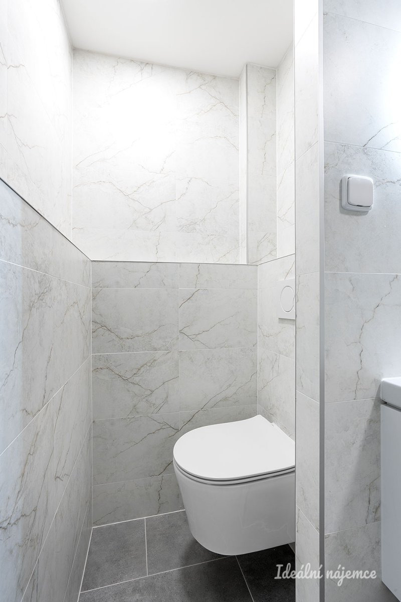 V koupelně se nachází vana, umyvadlo se zrcadlem, koupelnová skříňka a WC.