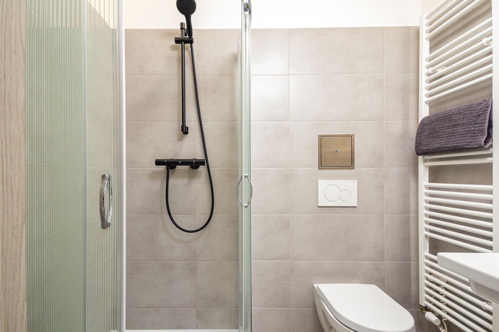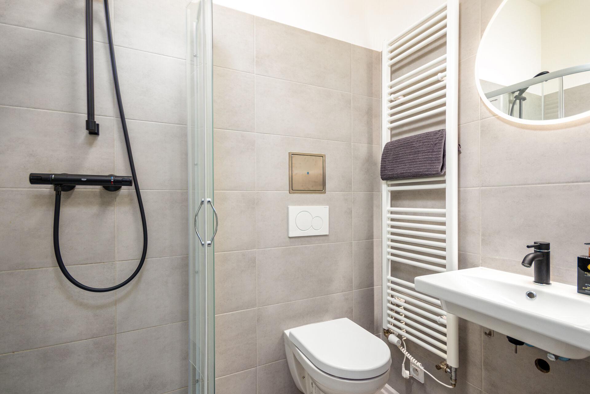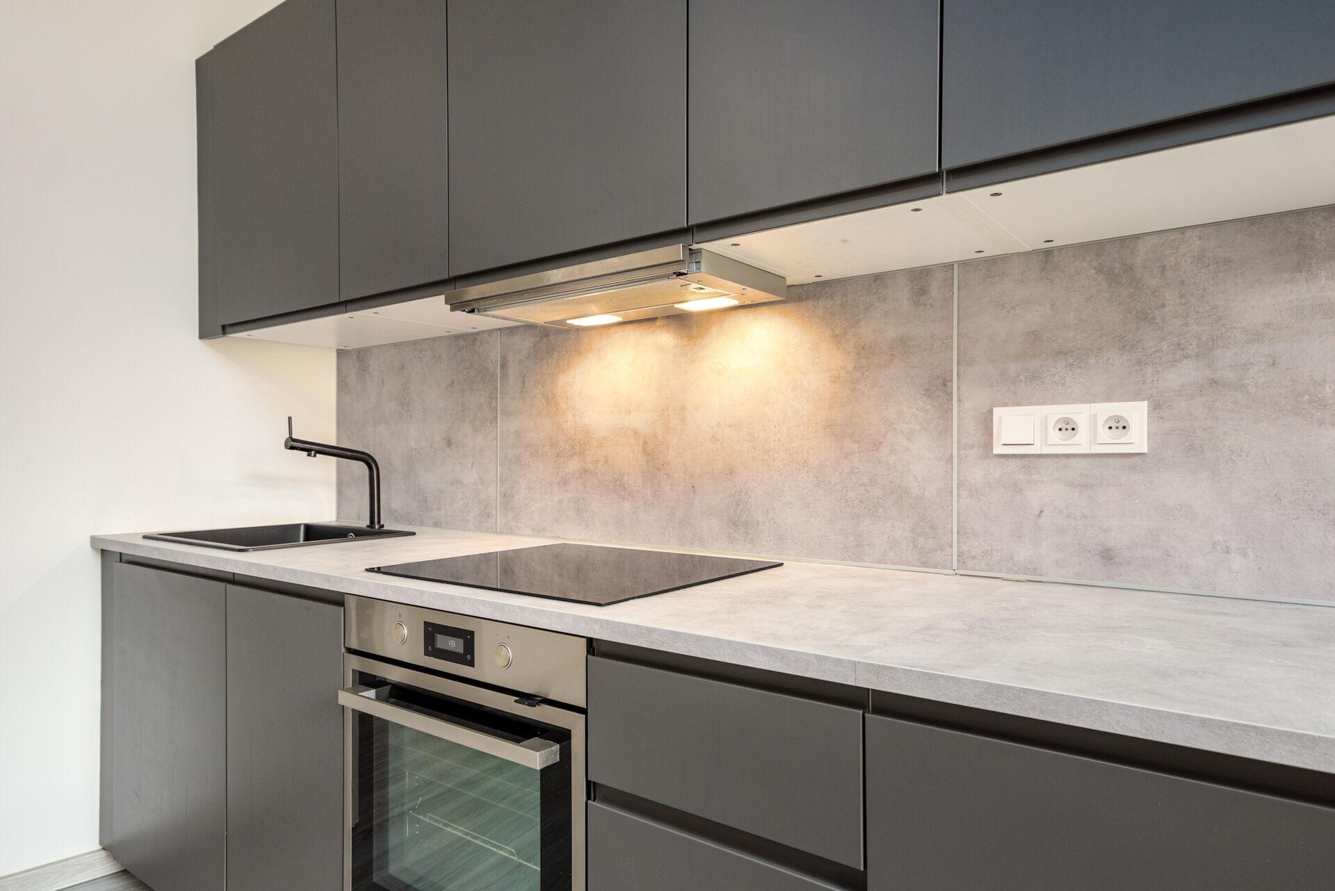 Po vstupu do bytu Vás přivítá prostorná chodba, ze které je vstup do koupelny se sprchovým koutem, toaletou a pračkou se sušičkou. Následuje obývací prostor s kuchyňským koutem, kde je moderní kuchyňská linka vybavená všemi spotřebiči, lednicí s mrazákem, myčkou, troubou, indukční varnou deskou a dalším vybavením.