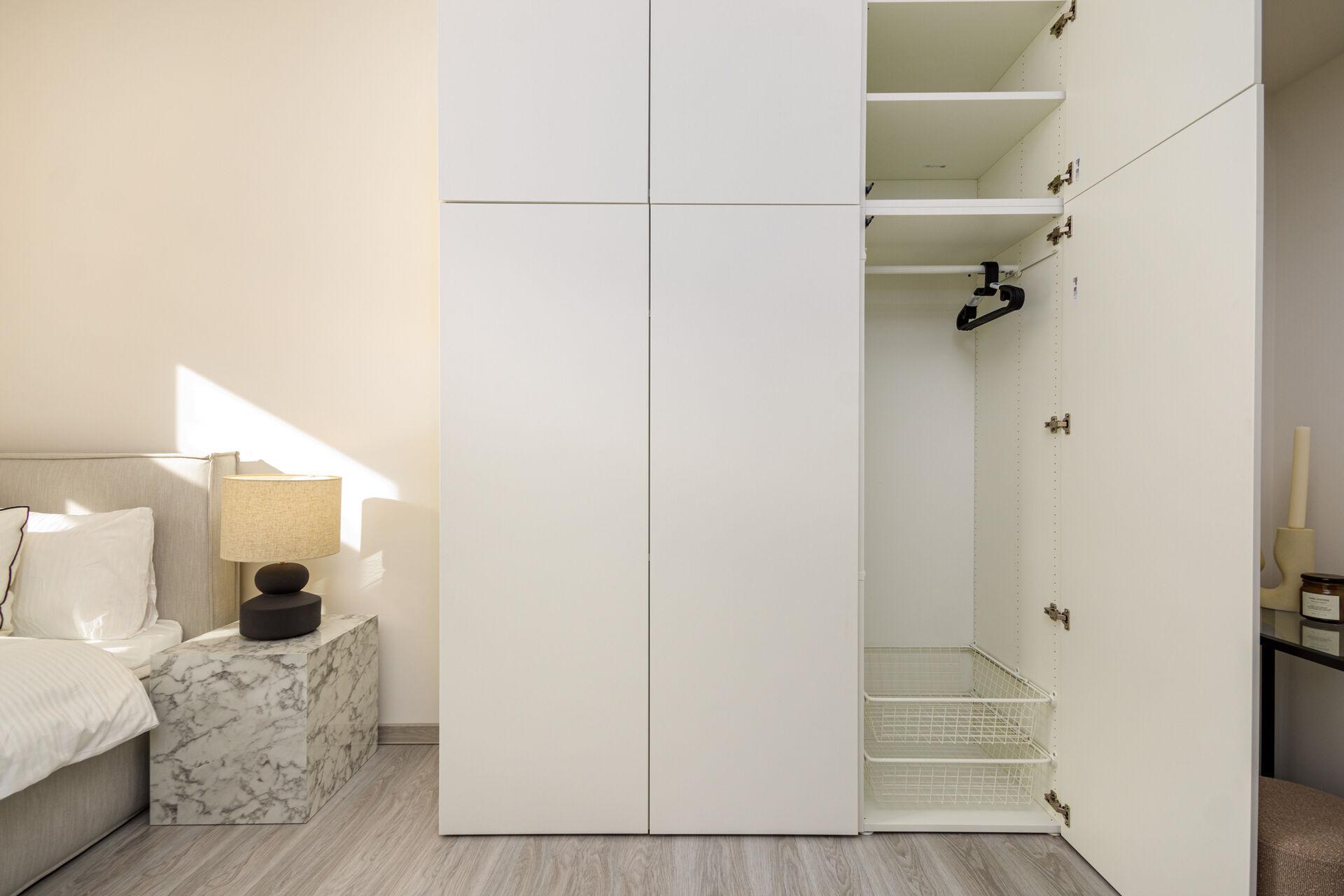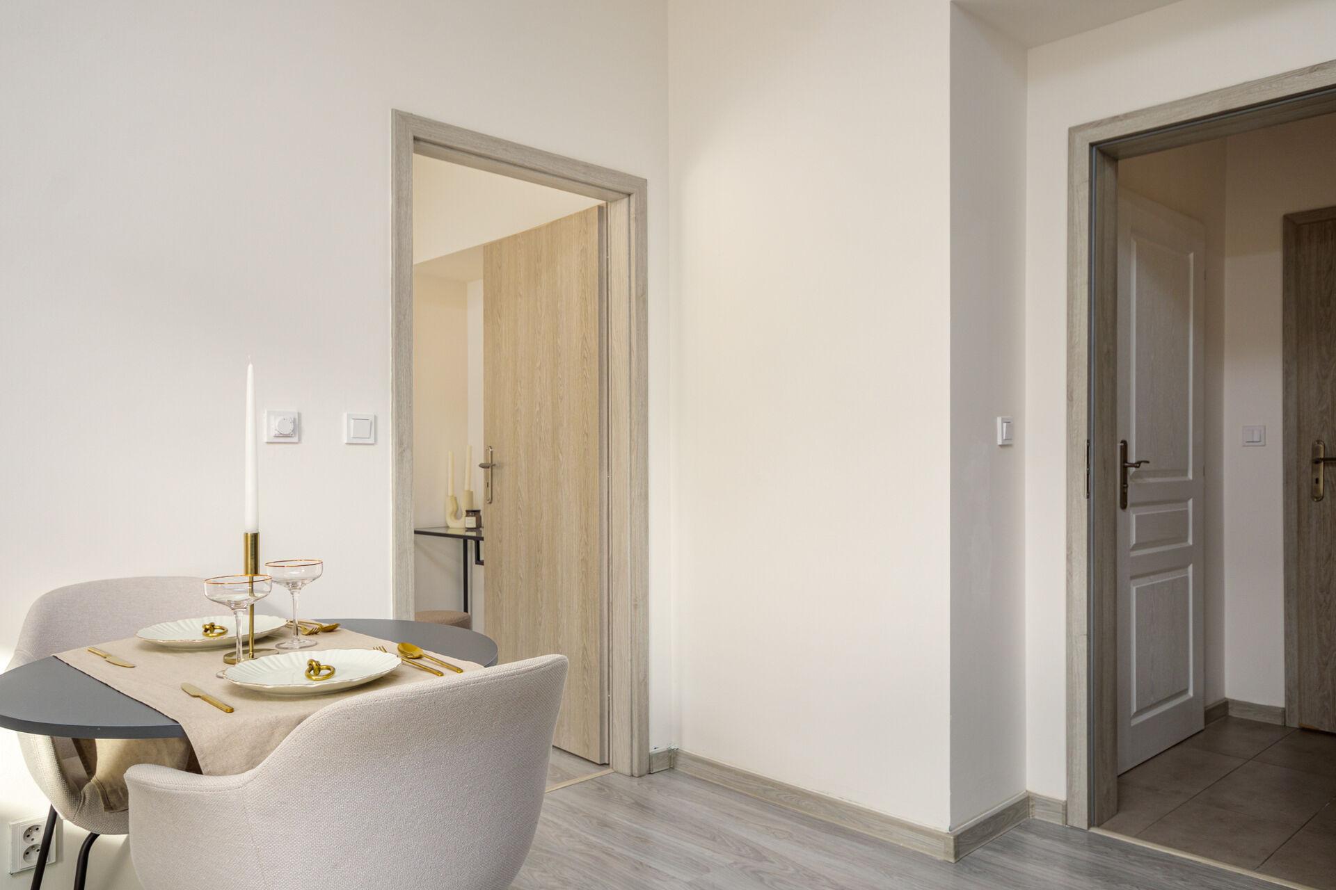 Po vstupu do bytu Vás přivítá prostorná chodba, ze které je vstup do koupelny se sprchovým koutem, toaletou a pračkou se sušičkou. Následuje obývací prostor s kuchyňským koutem, kde je moderní kuchyňská linka vybavená všemi spotřebiči, lednicí s mrazákem, myčkou, troubou, indukční varnou deskou a dalším vybavením.