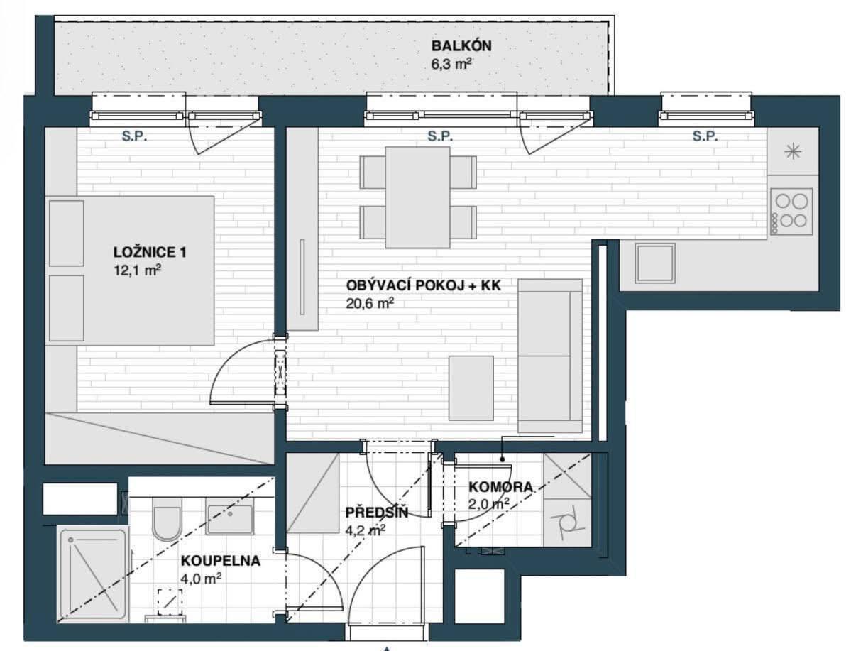Nabízíme k pronájmu nový byt 2+kk o celkové ploše 47 m and sup2; s balkonem, situovaný v novostavbě v lokalitě Praha 4 Kamýk.