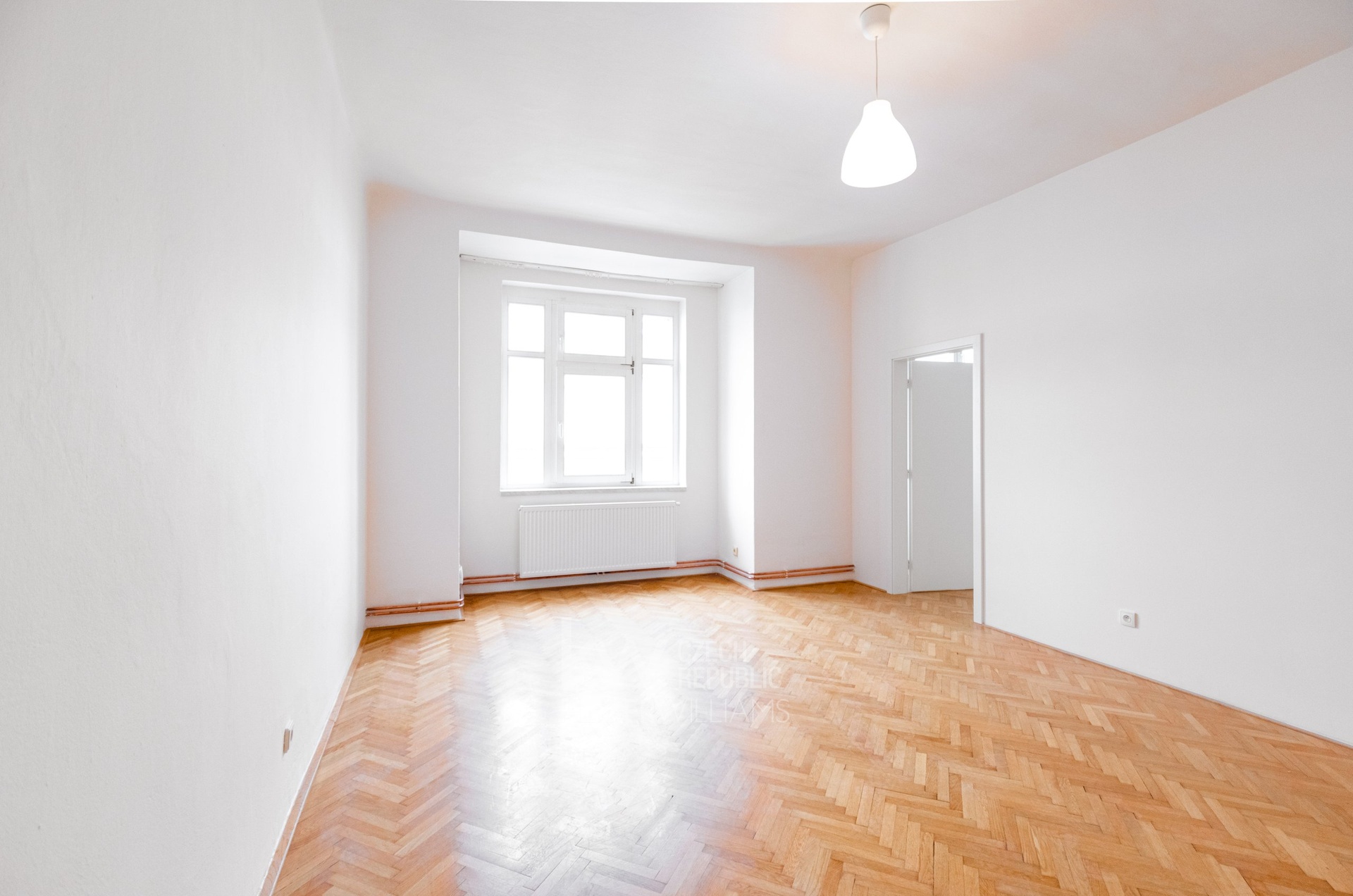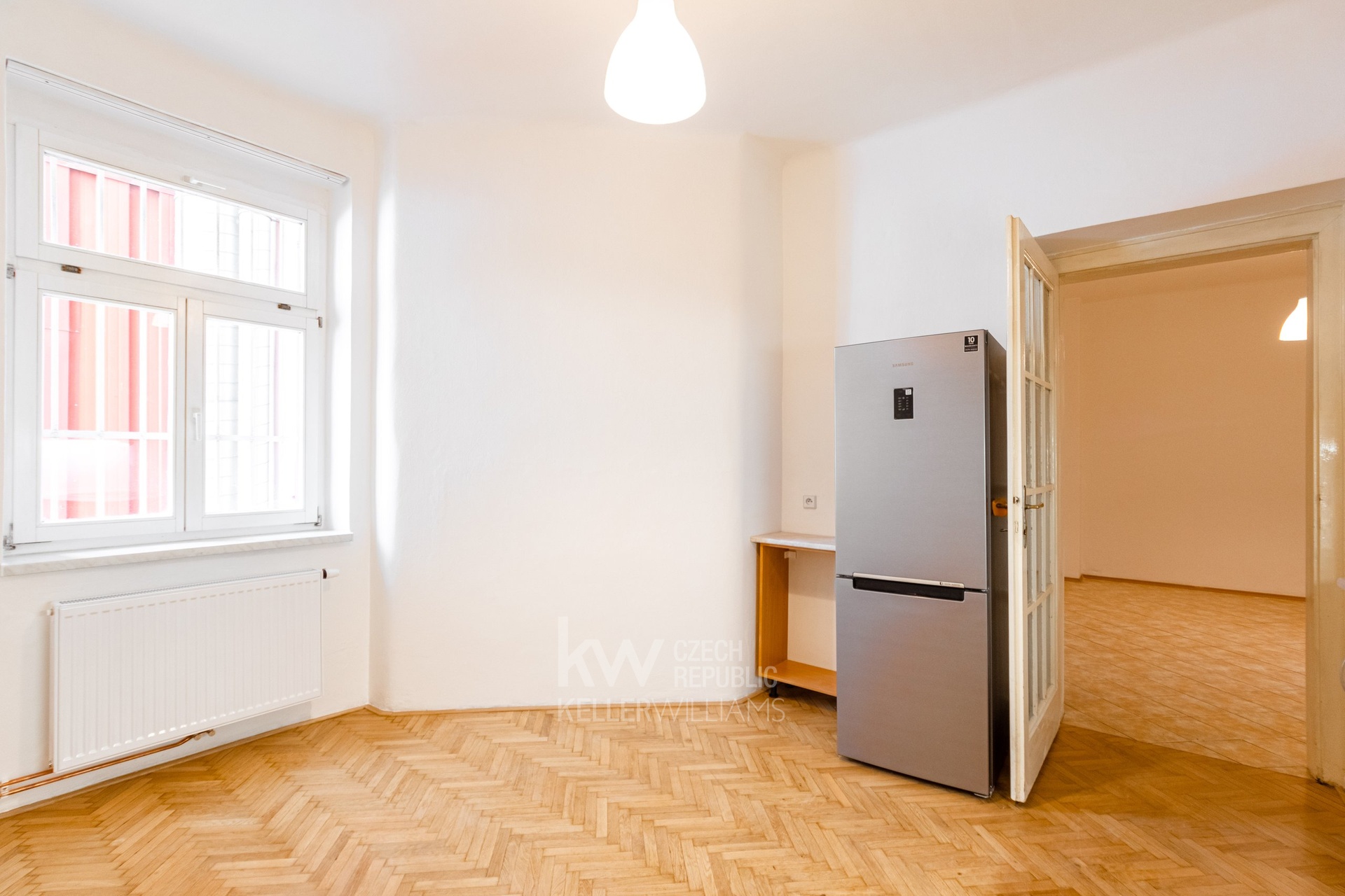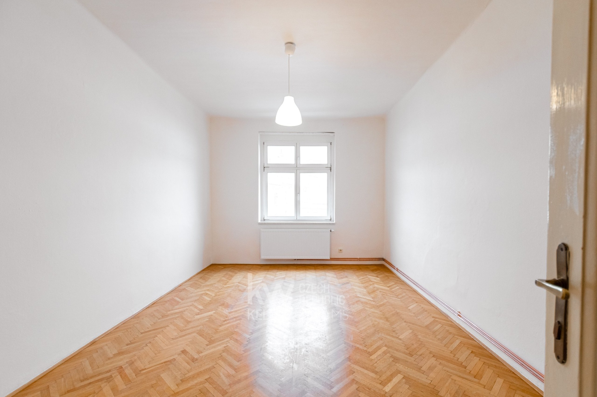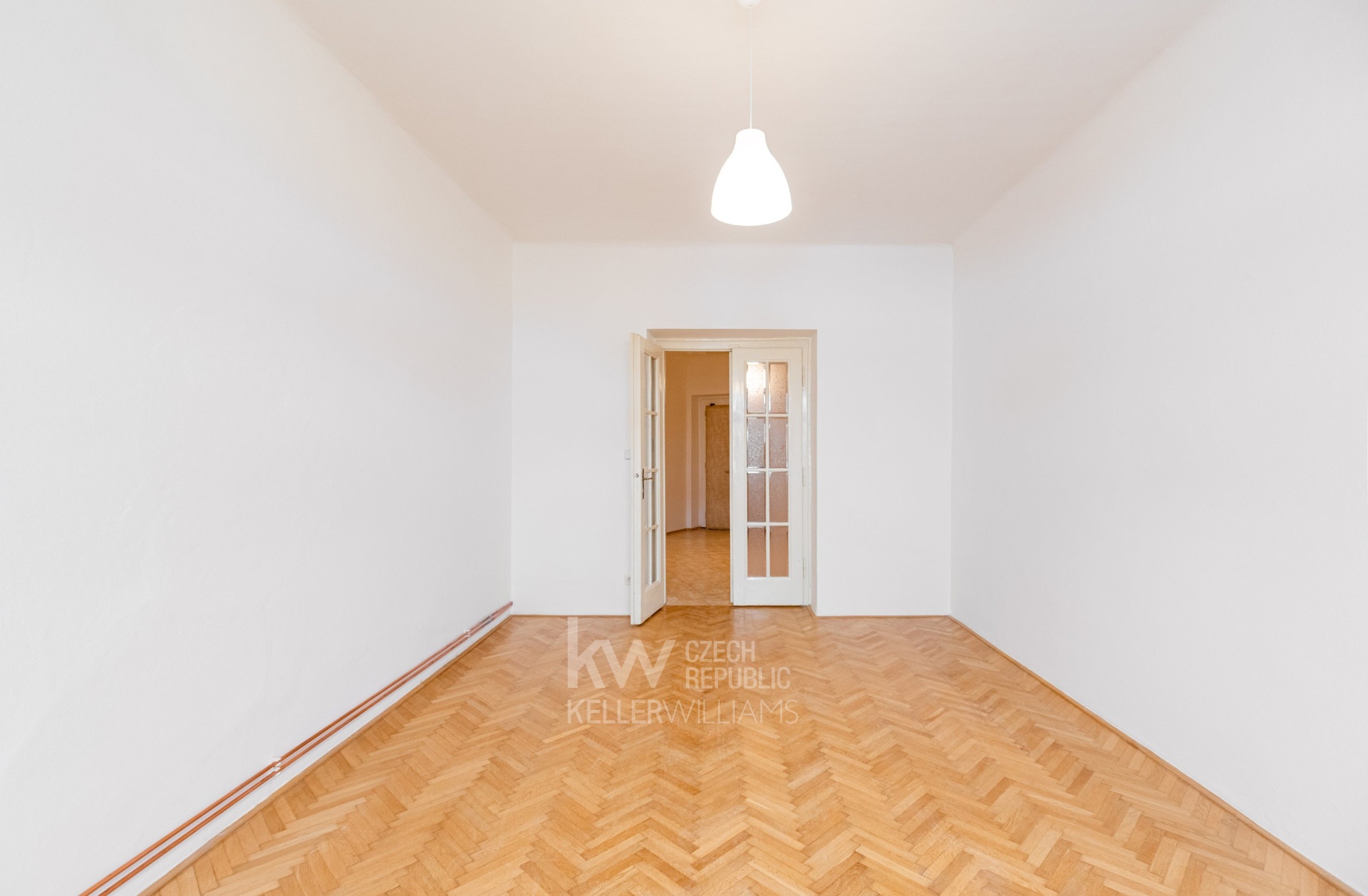Interiér nabízí příjemnou atmosféru – parketové podlahy, vysoké stropy a elegantní detaily. V obývacím pokoji je výrazný prvek (originální původní krbová vložka American heating), která podtrhuje charakter bytu. V ložnici potom najdete i praktickou komoru, která může složit například jako šatna.