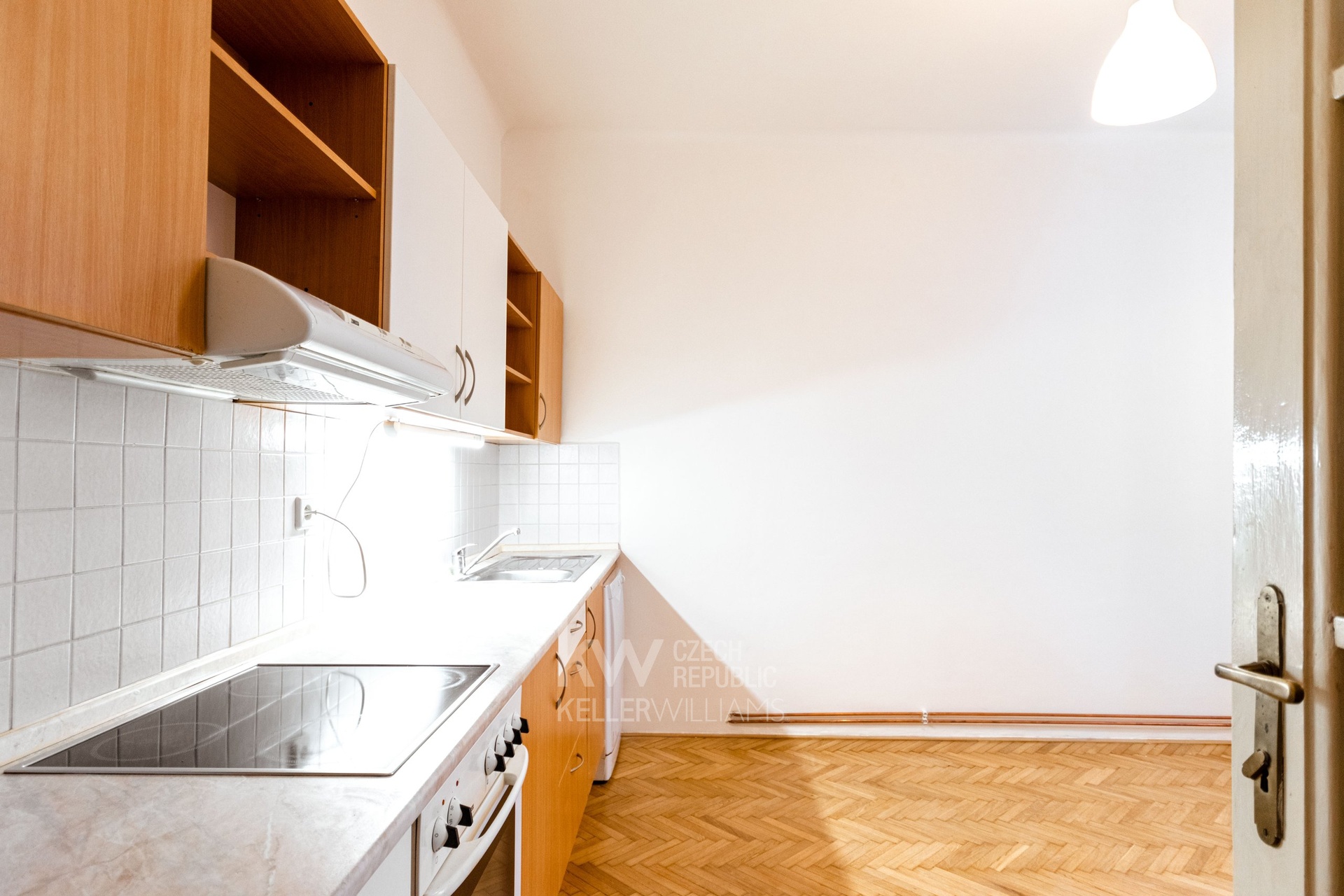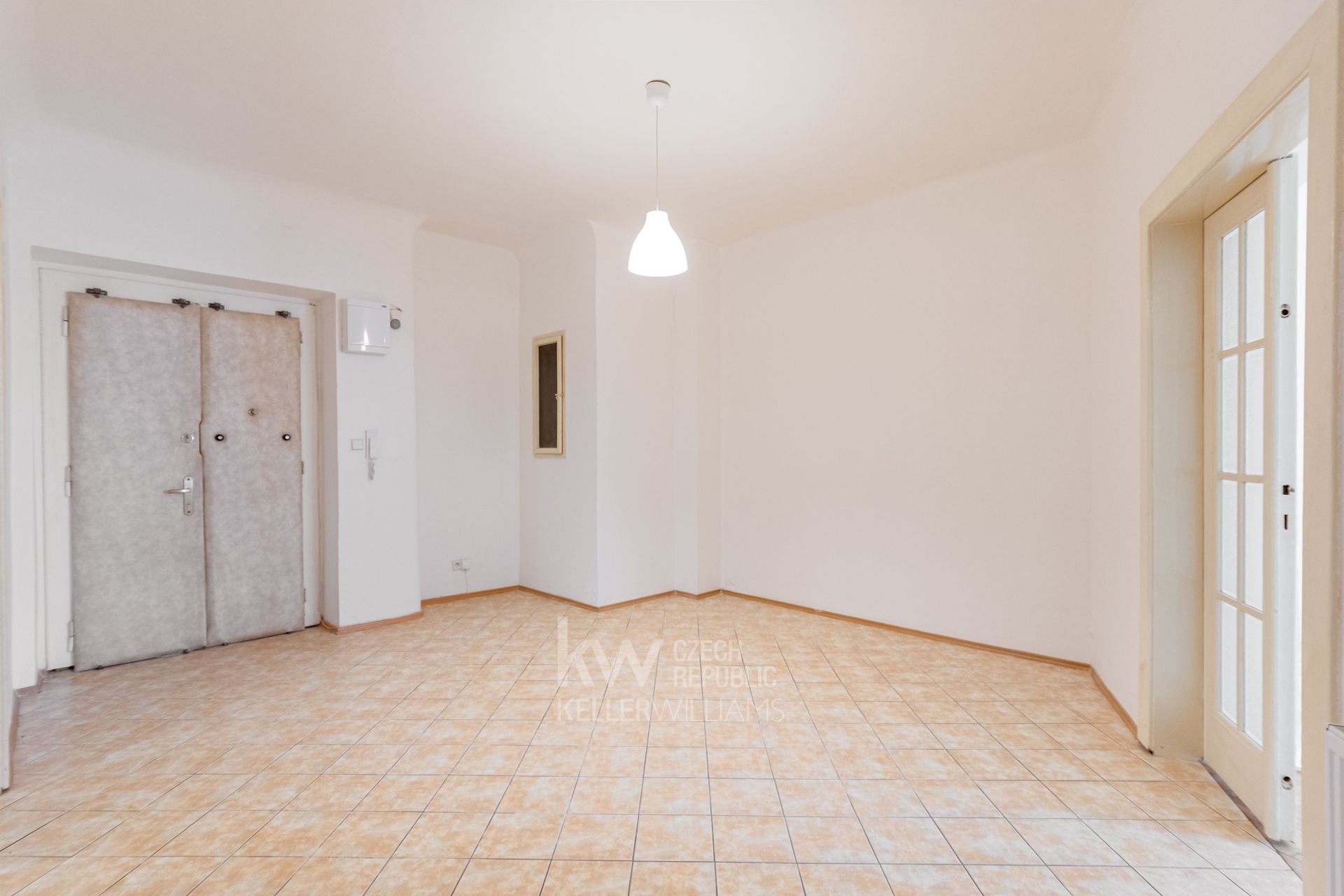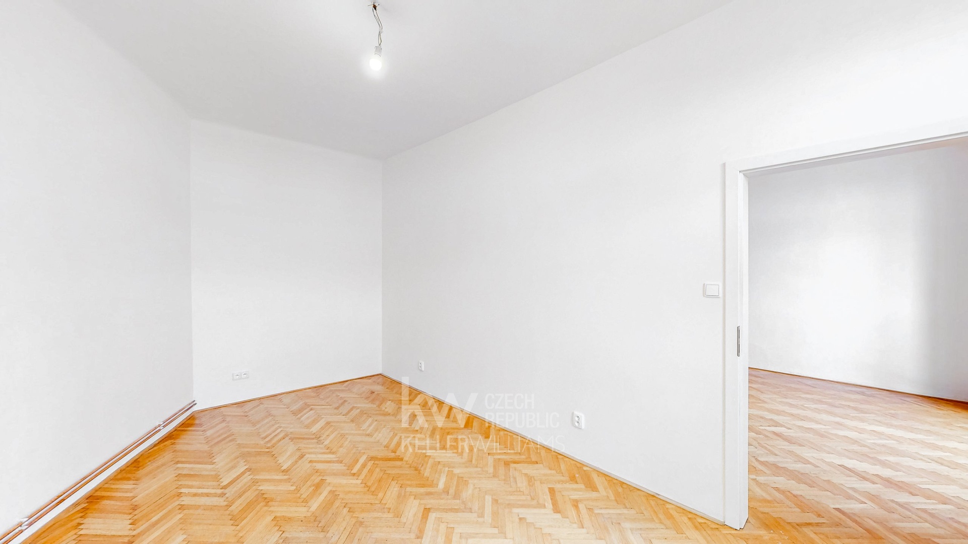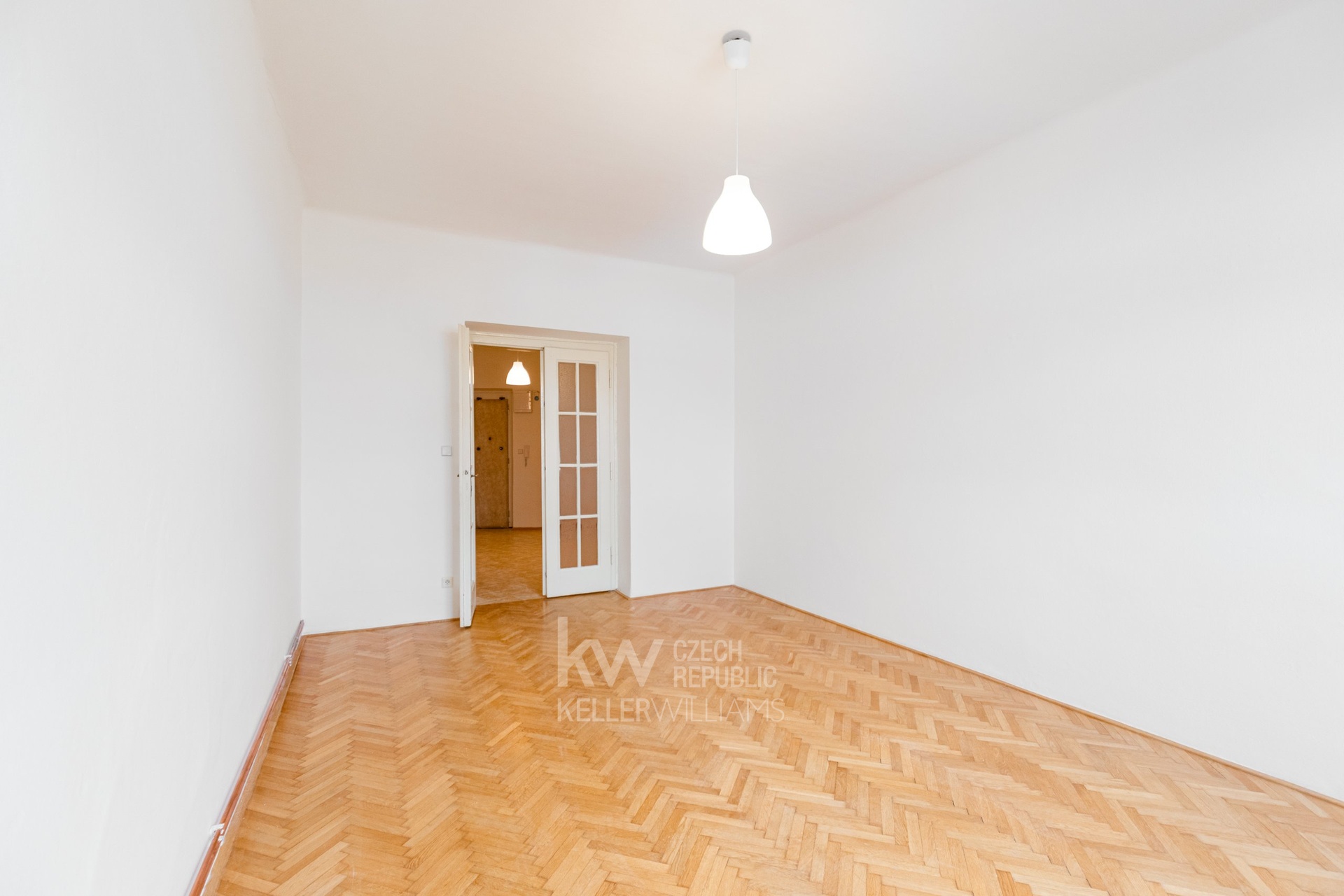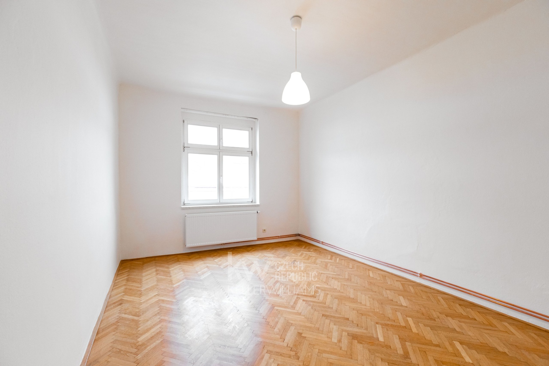 Interiér nabízí příjemnou atmosféru – parketové podlahy, vysoké stropy a elegantní detaily. V obývacím pokoji je výrazný prvek (originální původní krbová vložka American heating), která podtrhuje charakter bytu. V ložnici potom najdete i praktickou komoru, která může složit například jako šatna.