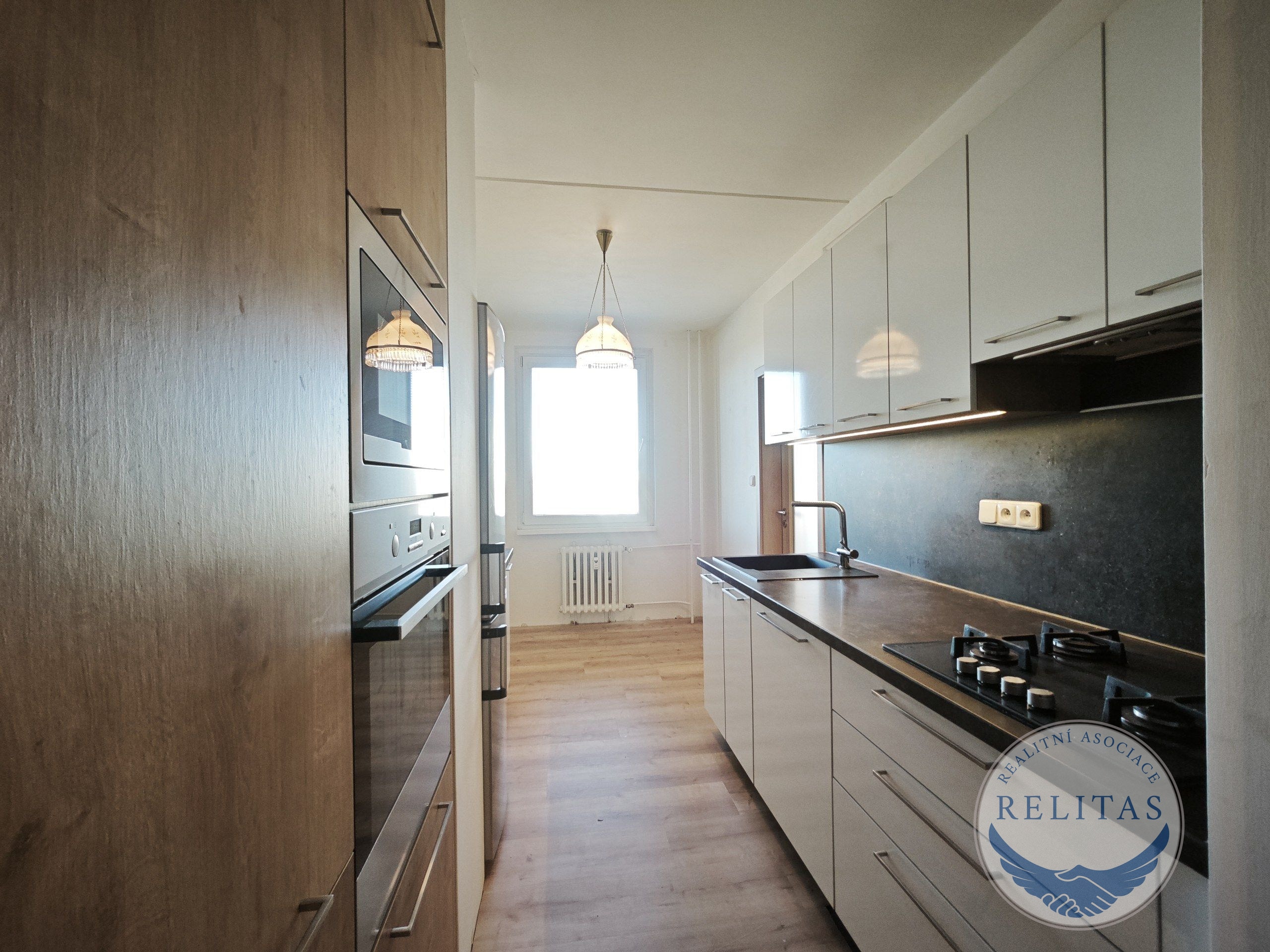 Kuchyň je vybavena varnou deskou, troubou, mikrovlnkou, myčkou nádobí a lednicí s mrazákem. Vytápění a teplá voda jsou řešeny centrálně dálkovým rozvodem, v bytě jsou klasické radiátory.