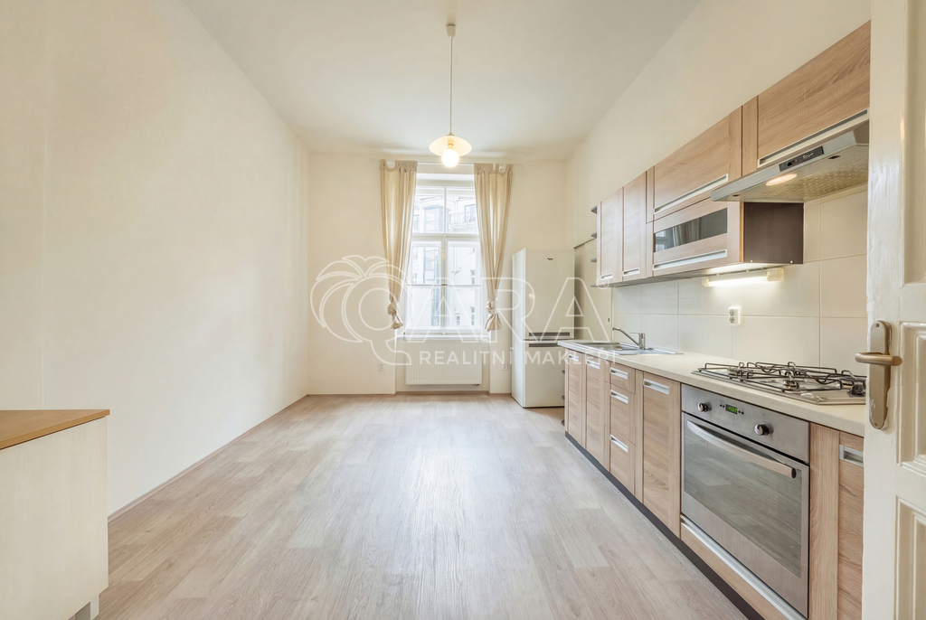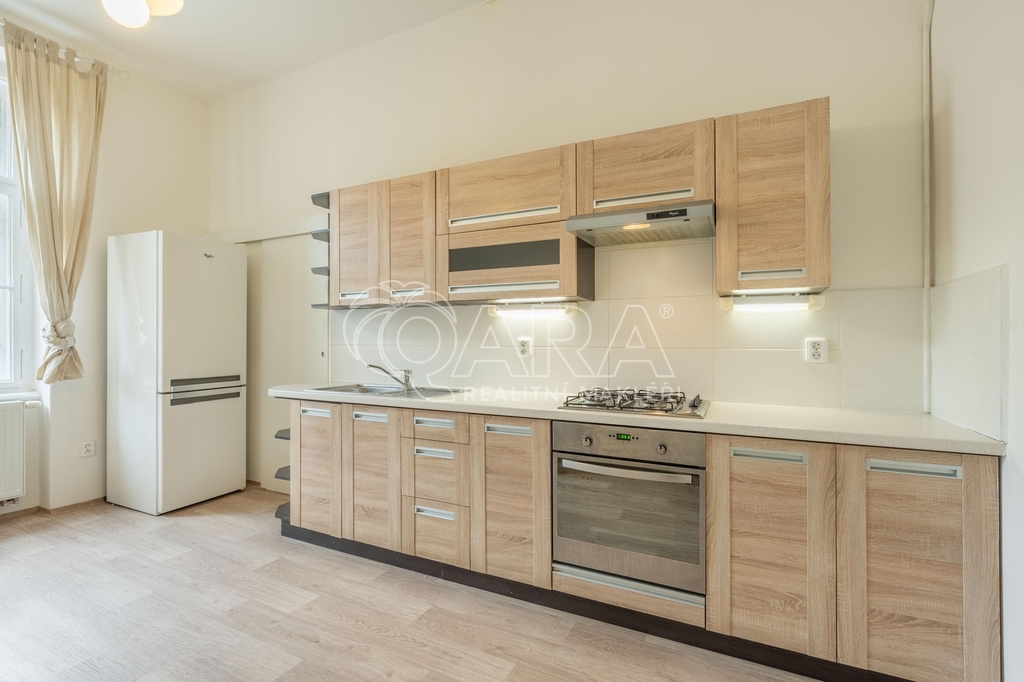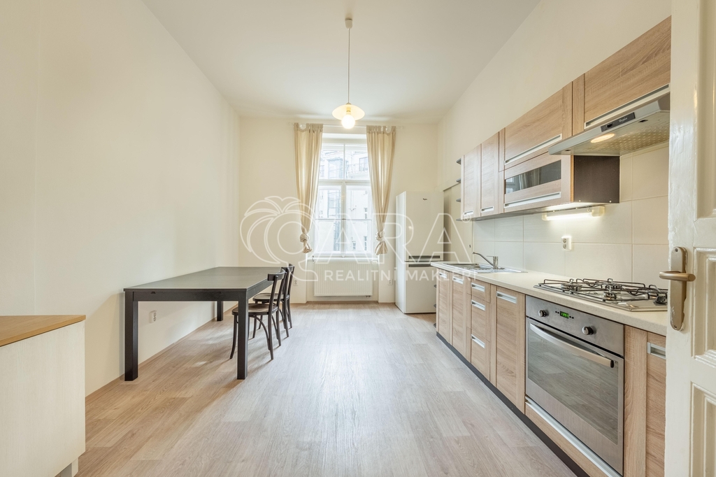 Dispozici tvoří obývací pokoj o velikosti 22,8 m² a sousedící pokoj o velikosti 18 m², oba orientované na sever do ulice Lužická. Do klidného vnitrobloku na jih směřuje ložnice o velikosti 16,3 m² a také samostatná kuchyně o stejné velikosti, která je vybavena kuchyňskou linkou, plynovou varnou deskou, elektrickou troubou, velkou lednicí a jídelním stolem se židlemi.