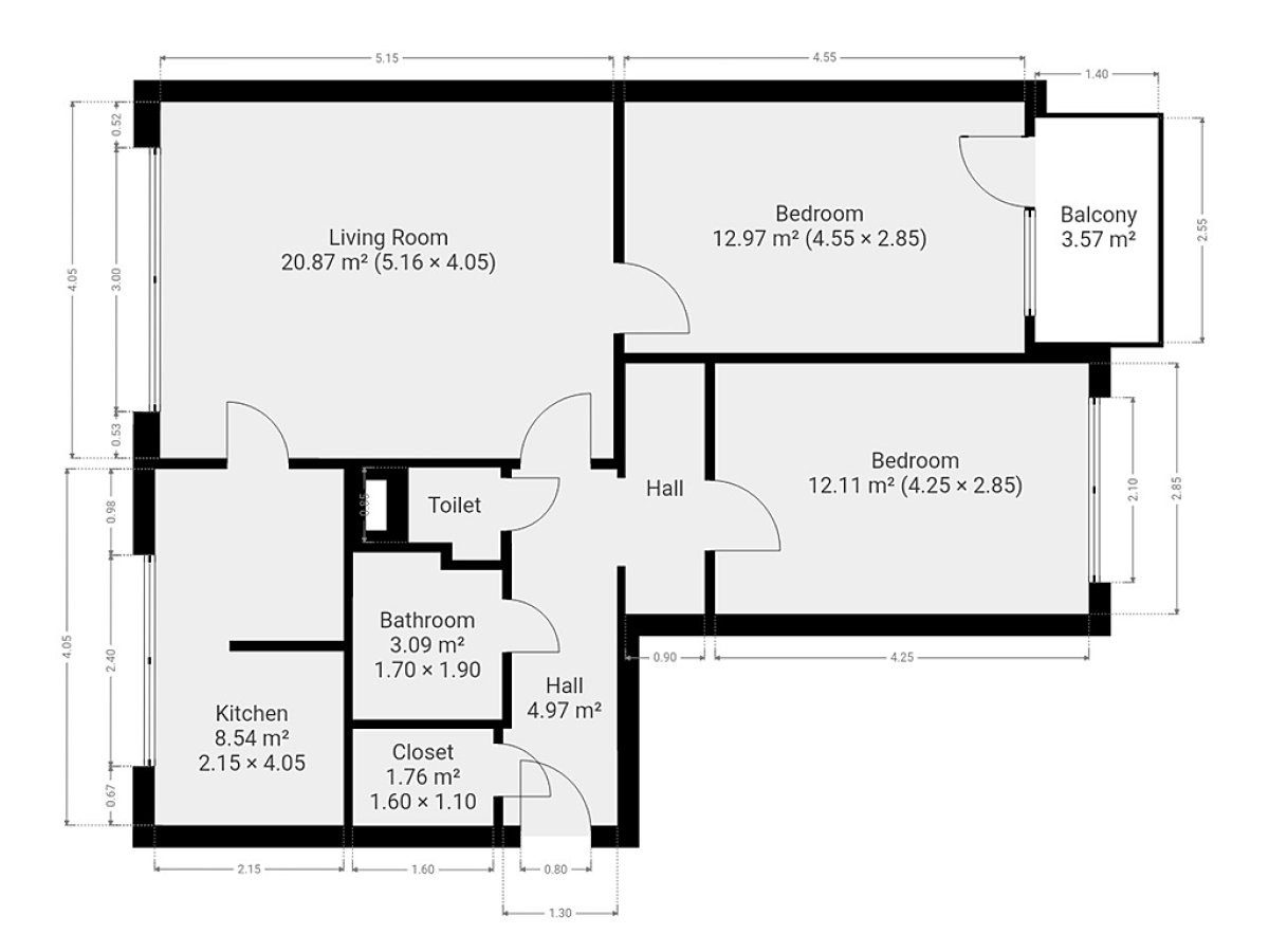Skládá se z centrální vstupní chodby, ze které se vchází do koupelny s vanou, pračkou a umyvadlem, samostatné toalety a praktické komory. Dále je zde ložnice, dětský pokoj, obývací pokoj se vstupem na balkón a kompletně zařízena kuchyně vestavnými spotřebiči.