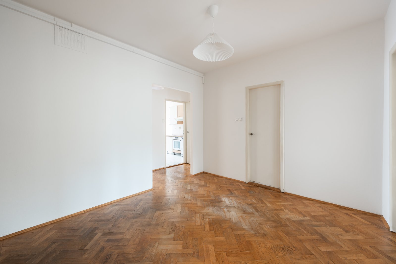 Součástí bytu je navíc menší pokoj původně určený pro služku, typický prvek domů této éry. Tento prostor je bez okna, není veden jako obytný pokoj, a dnes se ideálně hodí jako pracovna, šatna, archiv, úložný prostor nebo klidné zázemí pro home office. Právě tento detail dává bytu funkční přidanou hodnotu nad rámec běžného 3+1.