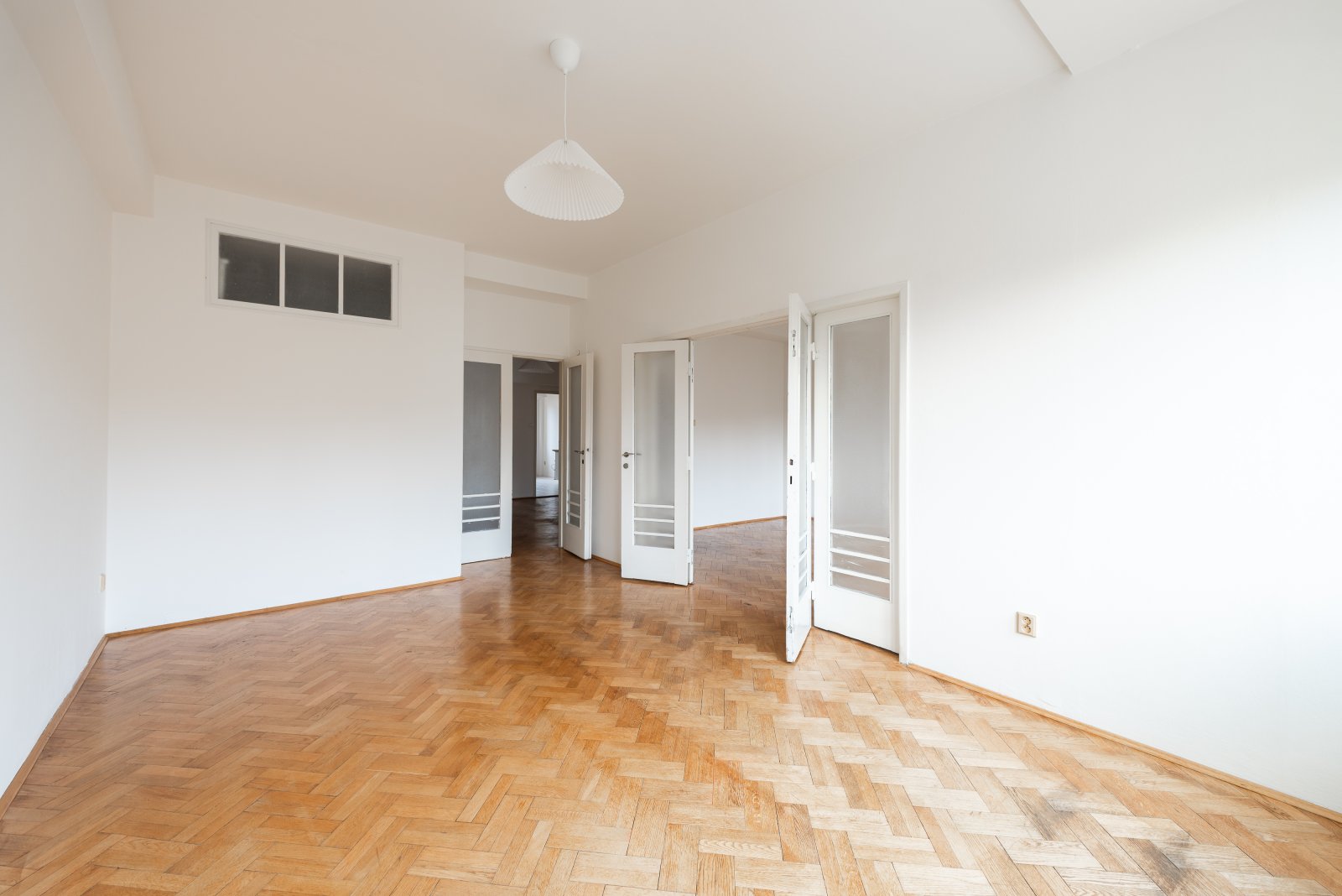 K pronájmu nabízíme byt o dispozici 3+1 (100 m2 podlahové plochy, 2 balkony o celkové výměře 5 m²), umístěný ve 2. patře udržovaného funkcionalistického domu s výtahem. Dispozice odpovídá tehdejším standardům kvalitního městského bydlení – tři velké, plnohodnotné obytné pokoje a samostatná kuchyň s dostatkem místa pro jídelní kout.