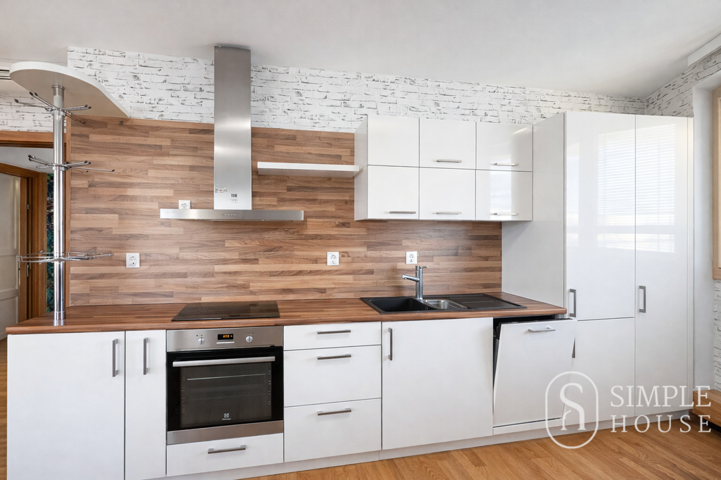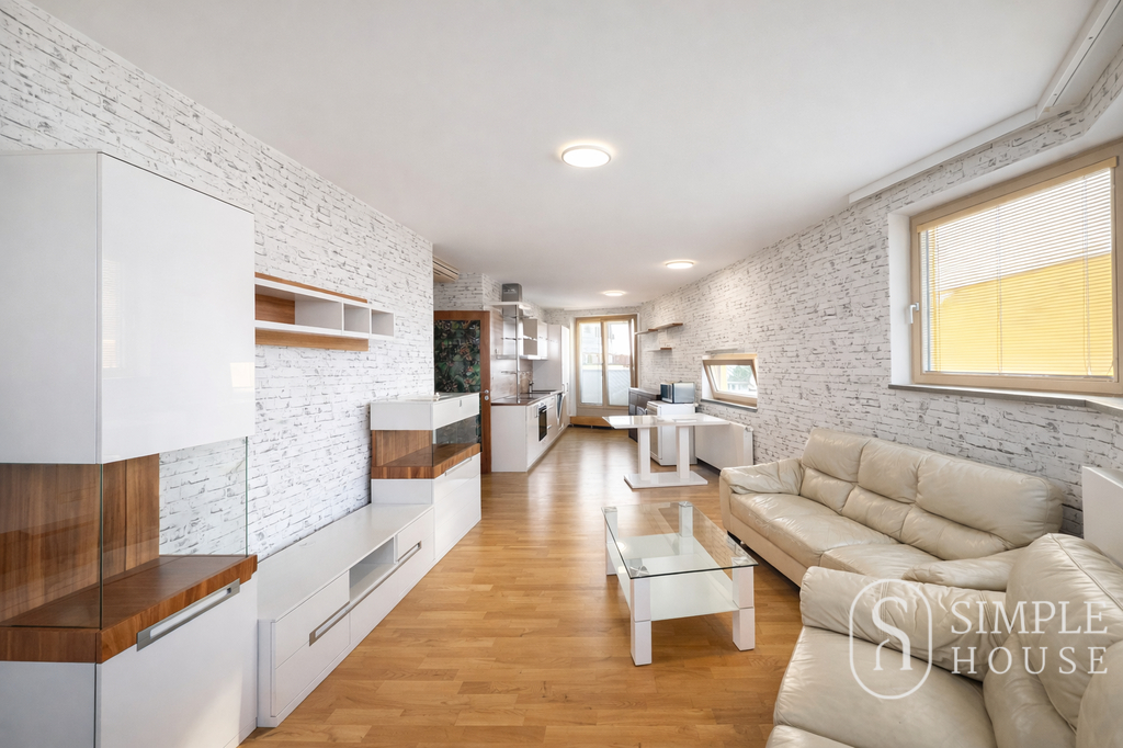 Obývací část je propojena s plně vybaveným kuchyňským koutem. K dispozici je moderní kuchyňská linka se všemi vestavěnými spotřebiči – indukční varná deska s troubou, myčka nádobí, lednice s mrazákem a digestoř. Součástí prostoru je také sedací souprava, jídelní stůl se židlemi a obývací stěna určená pro TV.