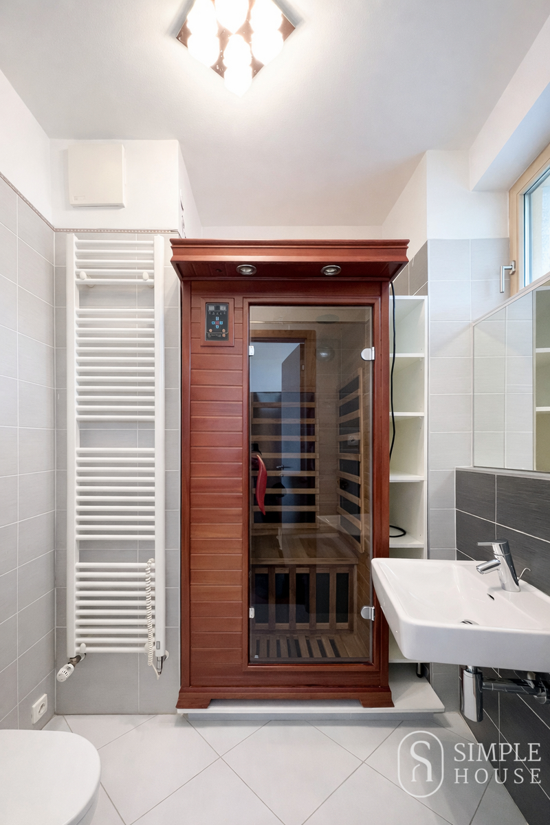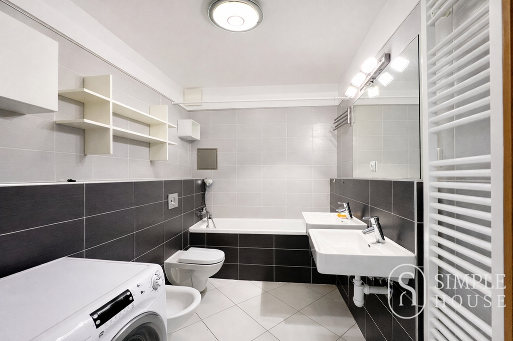 V bytě se nachází ještě druhá koupelna vybavená pračkou, umyvadlem a sanitou. V předsíni je k dispozici vestavěná skříň a praktická komora poskytující další úložný prostor. Komfort bydlení zvyšuje klimatizace v každé místnosti.