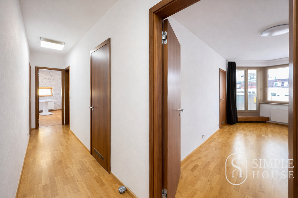 Nabízíme k dlouhodobému pronájmu prostorný a moderní byt 3+kk o celkové ploše 100 m² s terasou (10 m²) a balkonem (3 m²), situovaný v 6.NP v rezidenci Jeseniova, Praha 3 – Žižkov.