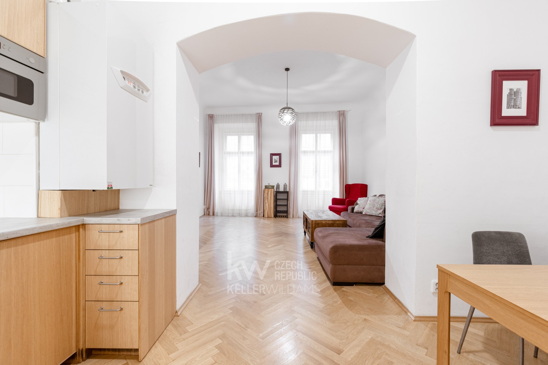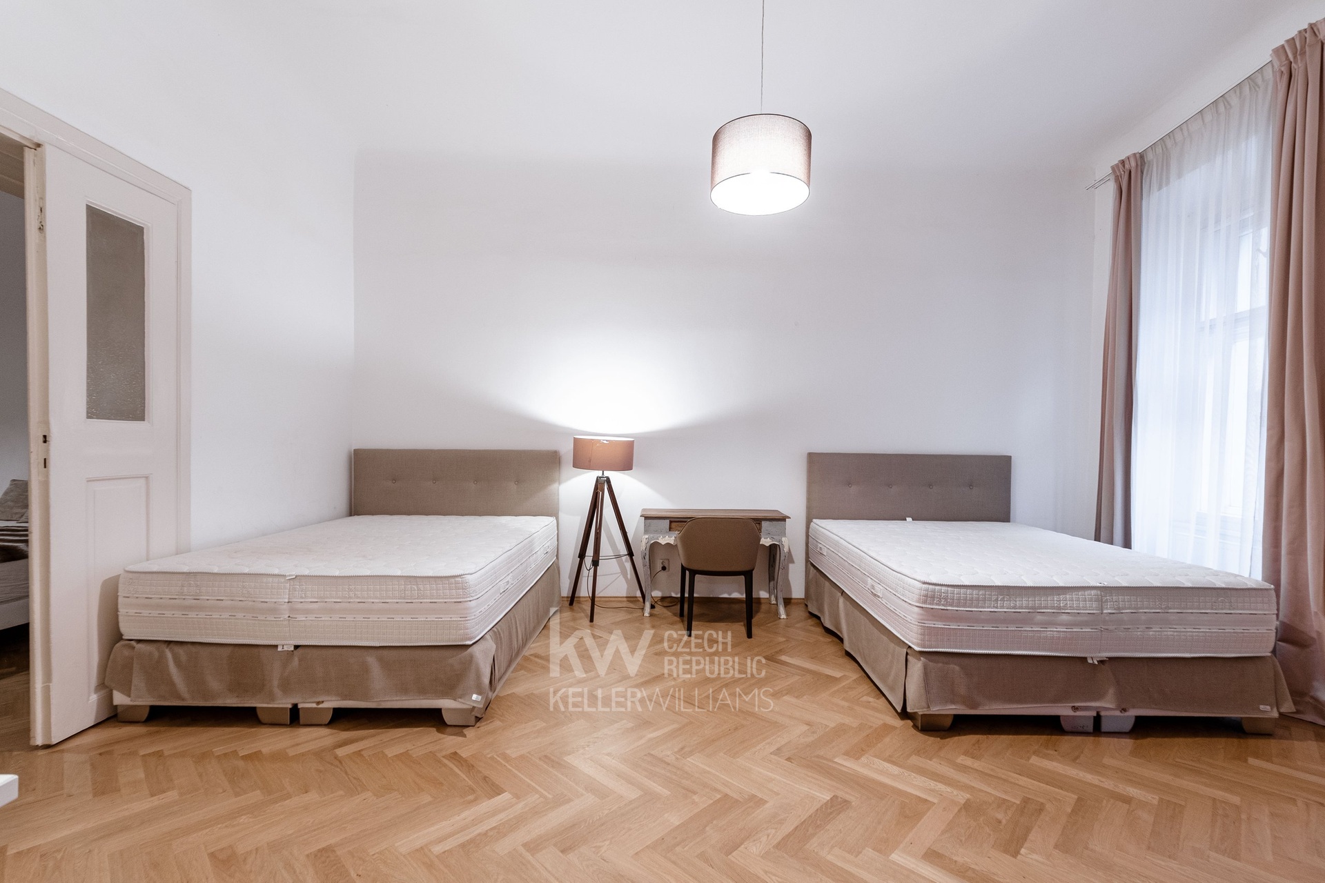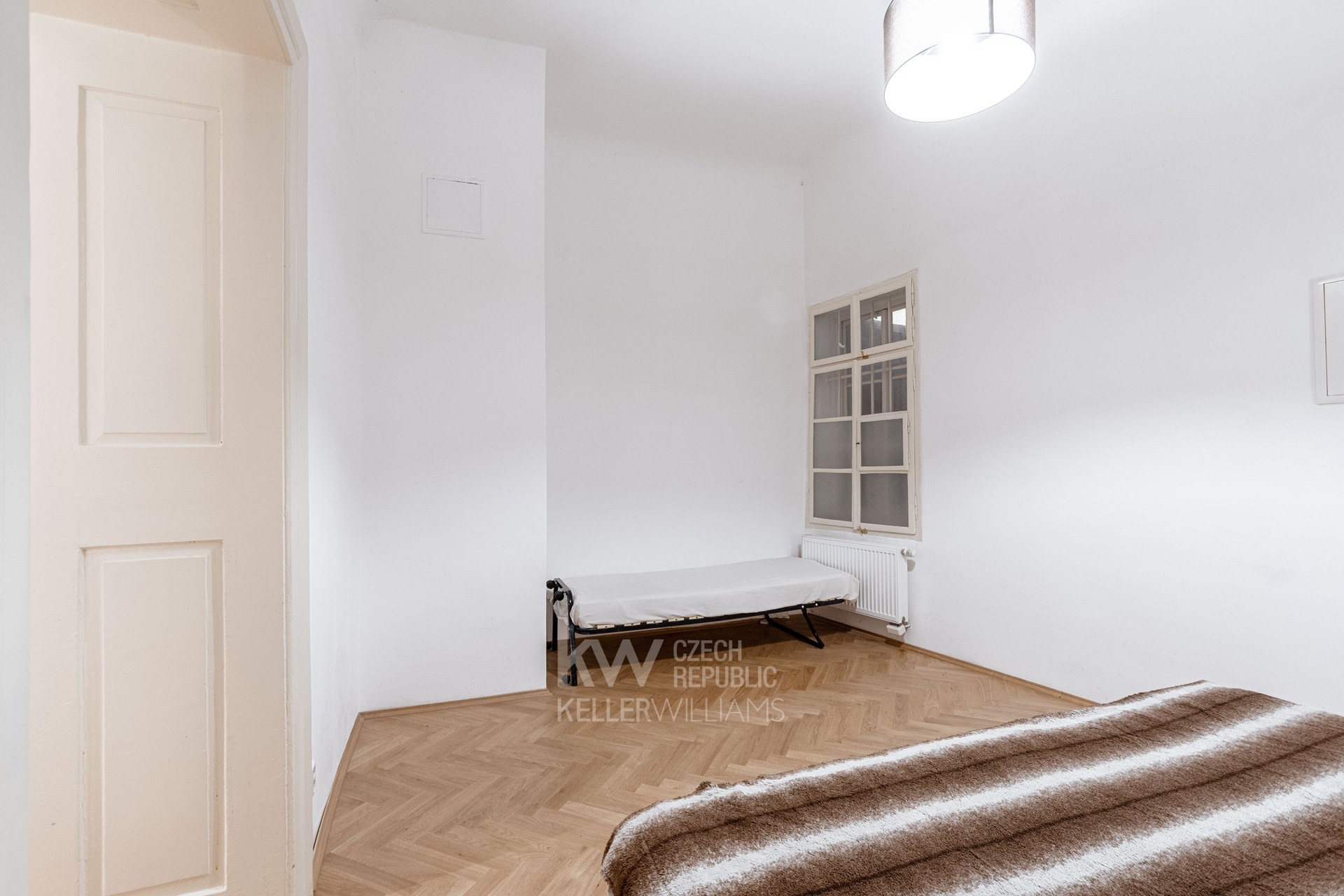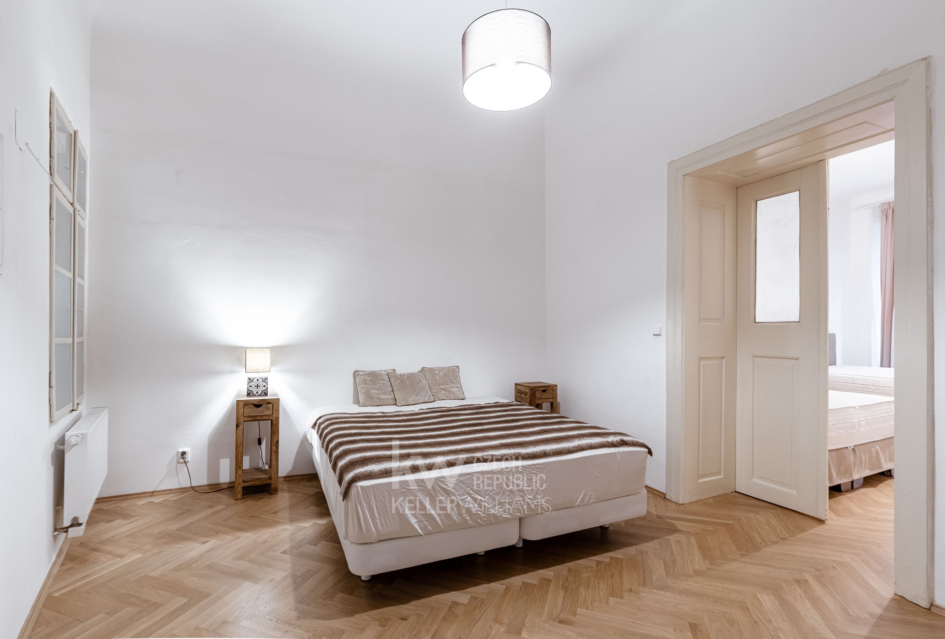 Dominantou bytu je velký obývací pokoj s rozlohou bezmála 27m2, který nabízí dostatek prostoru, oddělený kuchyňský kout, kde se nachází jídelní stůl. Dále zde najdete dvě průchozí prostorné ložnice, koupelnu, samostatnou toaletu a vstupní halu s místem pro úložné prostory. Vysoké stropy a původní podlahy dodávají bytu atmosféru klasického městského bytu v historickém centru. Kuchyňská linka je vybavena základními spotřebiči vč. myčky a mikrovlnné trouby.