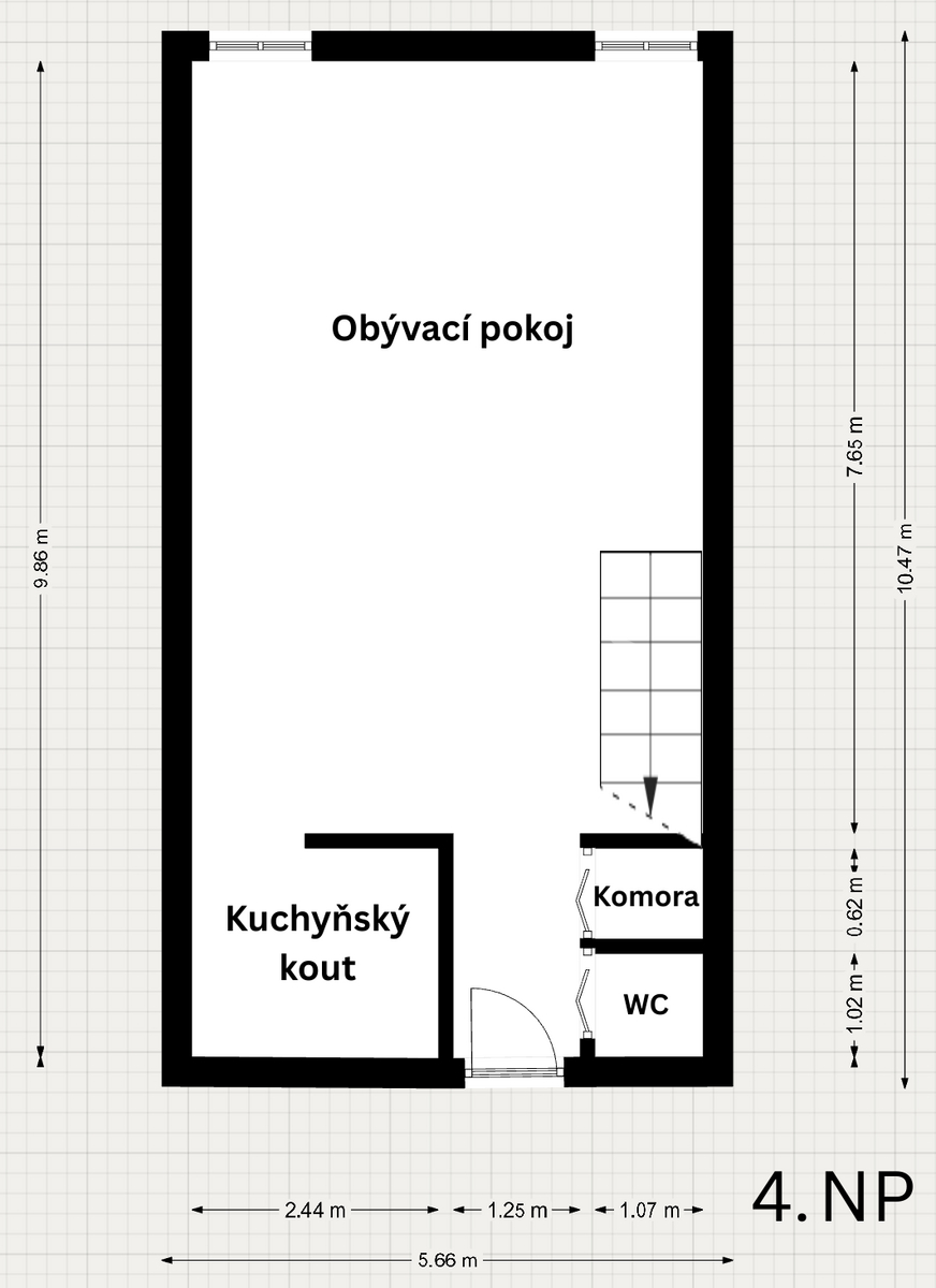 První patro bytu tvoří vzdušný obývací pokoj s krbem a prémiovým nábytkem, kuchyň vybavena vestavnými spotřebiči, samostatná toaleta a komora.