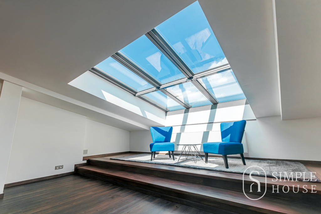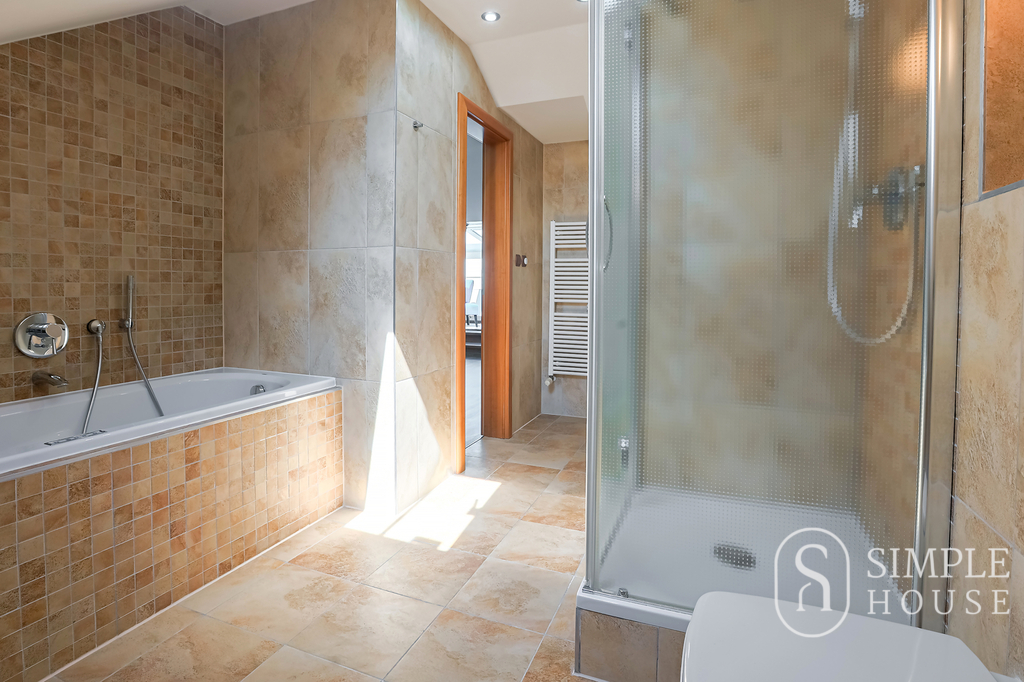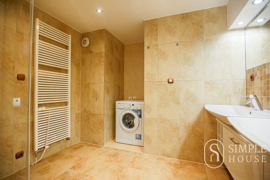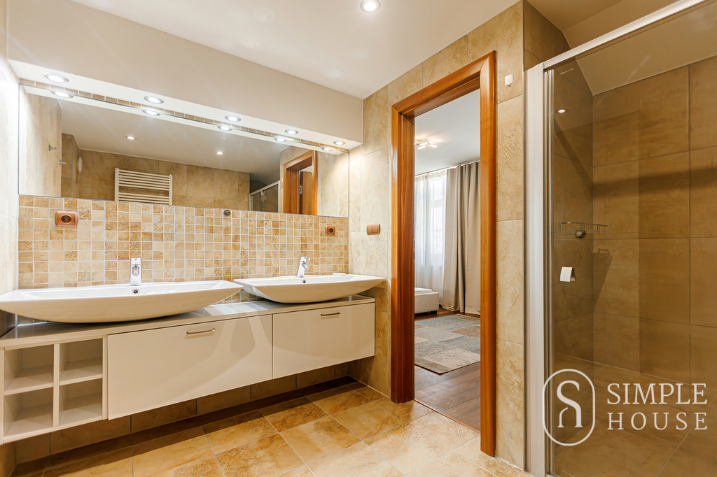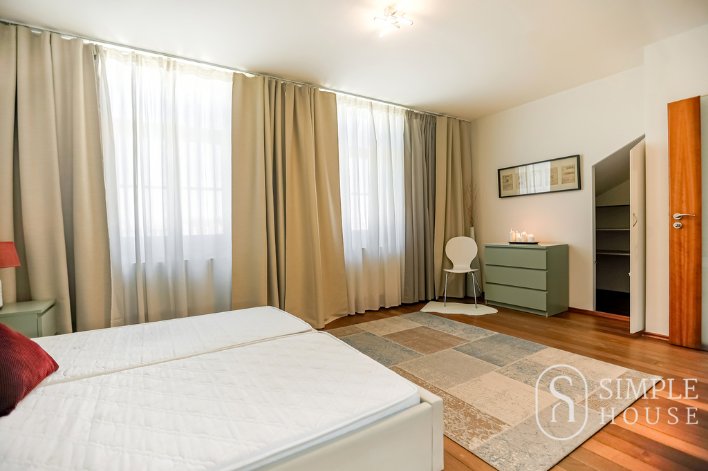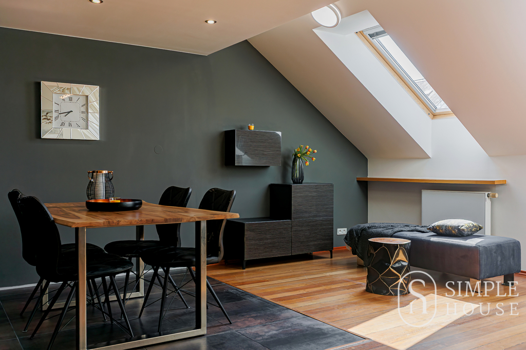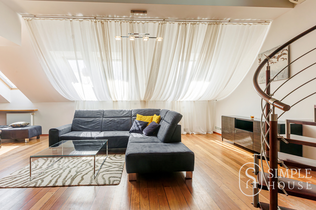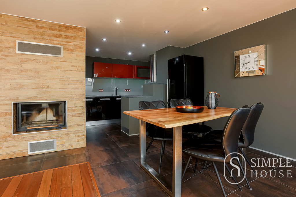 Dominantou bytu je velký obývací pokoj s krbem na dřevo, který vytváří výjimečně útulnou atmosféru. Prostor je navíc prosvětlen střešními okny na dálkové ovládání, která zajišťují dostatek denního světla v průběhu celého dne. Kvalitní dřevěné podlahy a dřevěná okna podtrhují elegantní charakter tohoto bydlení.