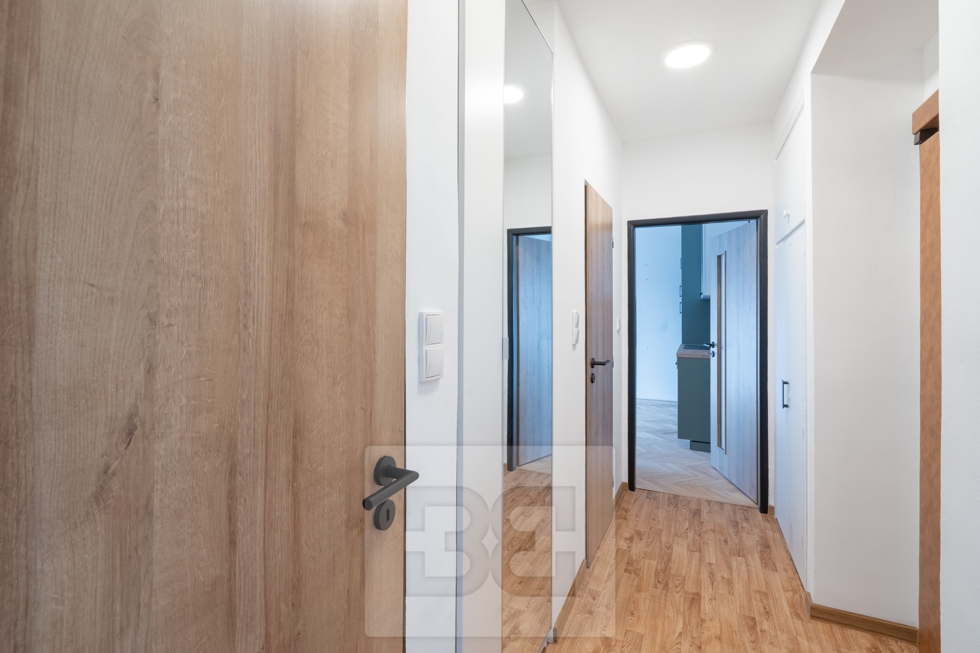 Dominantou bytu je světlý obývací prostor s moderní kuchyní vybavenou spotřebiči – myčka, trouba, indukční varná deska a lednice s mrazákem. Z obývacího pokoje je přímý vstup na prostorný balkon s příjemným výhledem do okolí. Na balkon je vstup také z menšího pokoje, který se nachází hned za obývací částí.