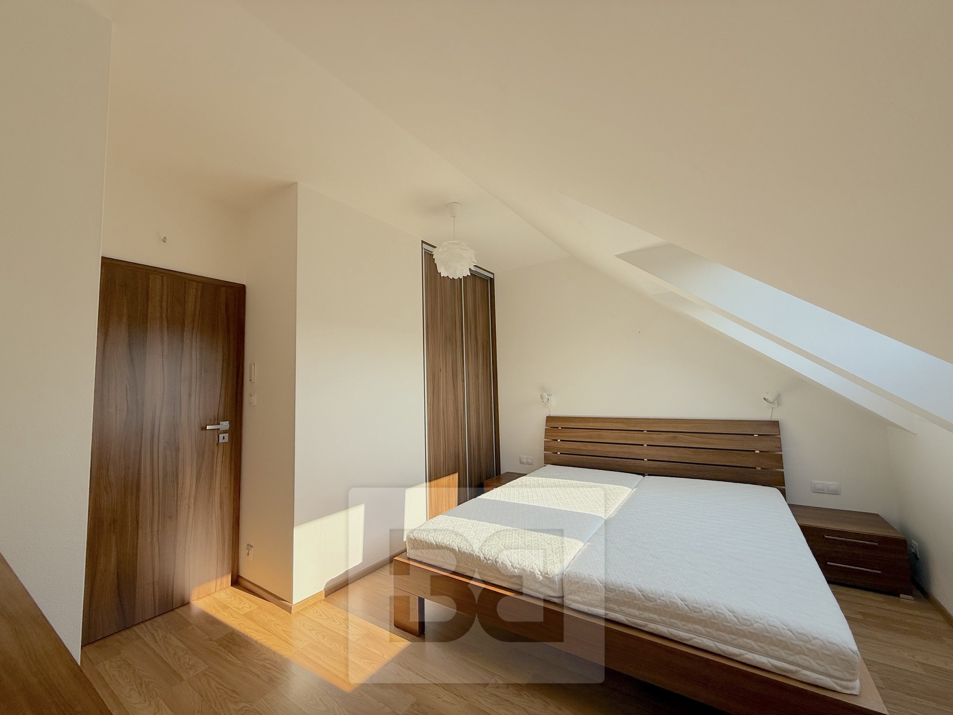 Nabízíme k pronájmu krásný, světlý byt 3+kk o velikosti 67 m² s garážovým stáním, situovaný v podkroví udržovaného bytového domu. Byt zaujme množstvím vestavěných úložných prostor. Budova se nachází v klidné, slepé ulici. Na střešních oknech jsou venkovní elektrické žaluzie.