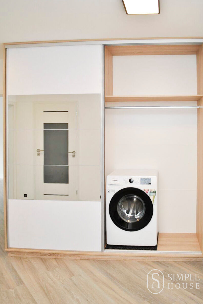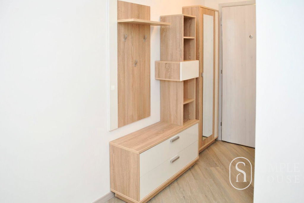 Praktická dispozice zahrnuje vstupní chodbu s vestavnou zrcadlovou skříní a předsíňovou stěnou, obývací pokoj, dvě samostatné ložnice, kuchyň, koupelnu s vanou spojenou s toaletou. Kuchyň je plně vybavená moderní kuchyňskou linkou se spotřebiči (indukční varná deska, digestoř, horkovzdušná trouba, mikrovlnná trouba, lednice) a myčkou nádobí. K vybavení patří také pračka.
