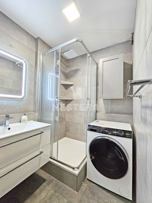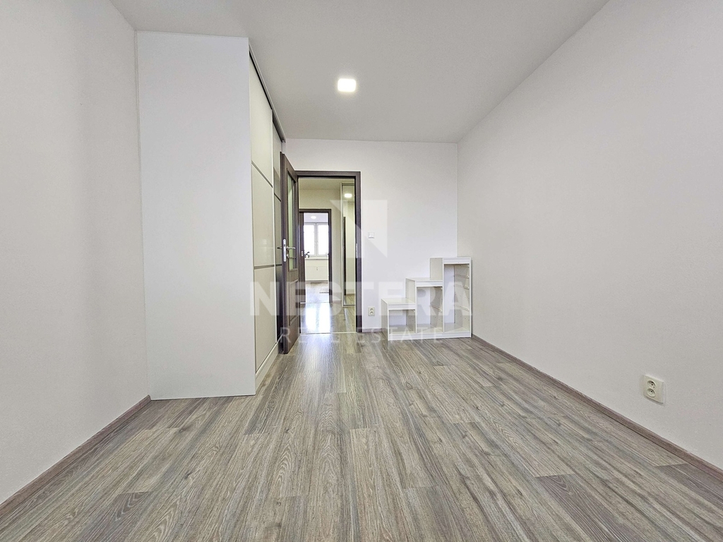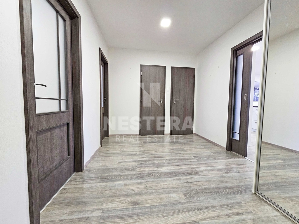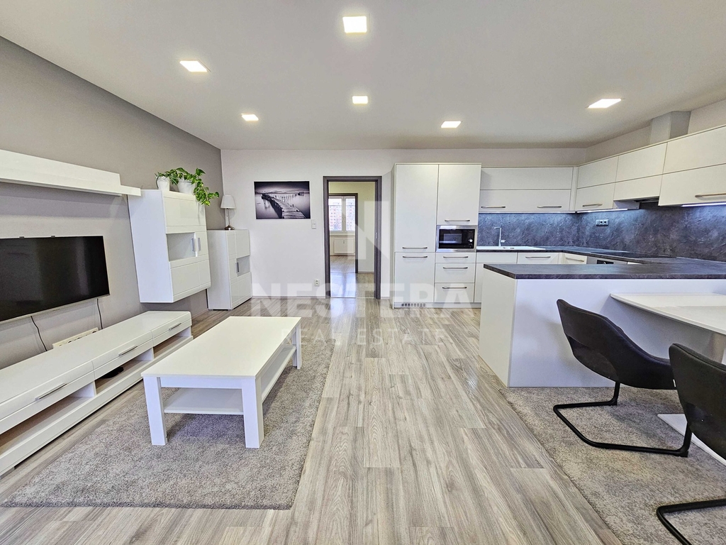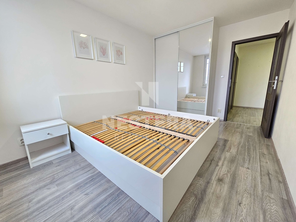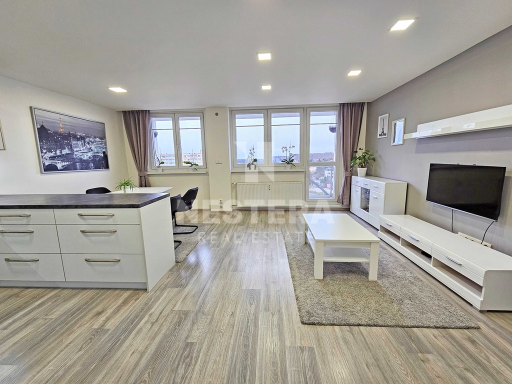 Byt prošel kompletní rekonstrukcí a skládá se ze vstupní haly, obývacího pokoje s kuchyňským koutem a vstupem na lodžii s velmi pěkným výhledem. Dále z pokoje, ložnice, koupelny a samostatné toalety. K dispozici je kompletně vybavený kuchyňský kout a nábytek dle fotografií. Vnitřní plocha bytu je 71 m2, lodžie má výměru zhruba 6,5 m2. Součástí pronájmu je také prostorná komora pro uložení sezónních věcí.
