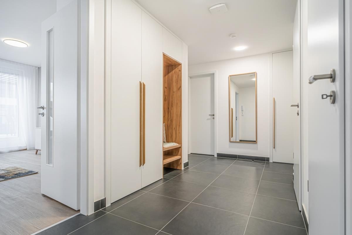 U vstupu do bytu se nachází předsíň s botníkem, šatní skříní s věšáky. Byt je vybaven vestavěnými skříněmi, kuchyňskou linkou s vestavěnými spotřebiči, jídelním stolem, židlemi, sedačkou, konferenčním stolem, komodou a SMART televizí. V ložnici se nachází dvoulůžková postel s matracemi, noční stolky a vestavěná skříň. V koupelně se nachází sprchový kout. V technické místnosti je zabudována pračka se sušičkou.