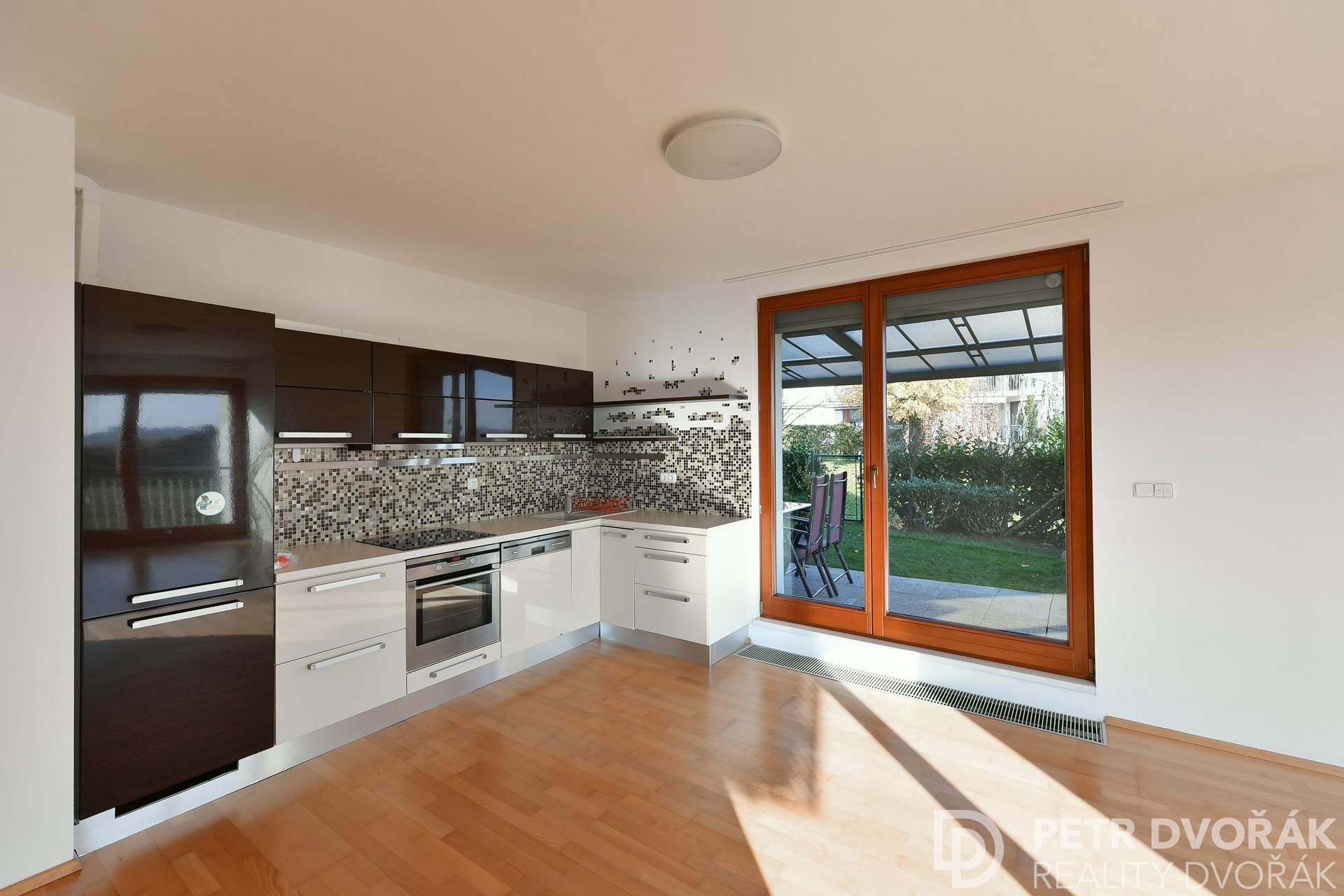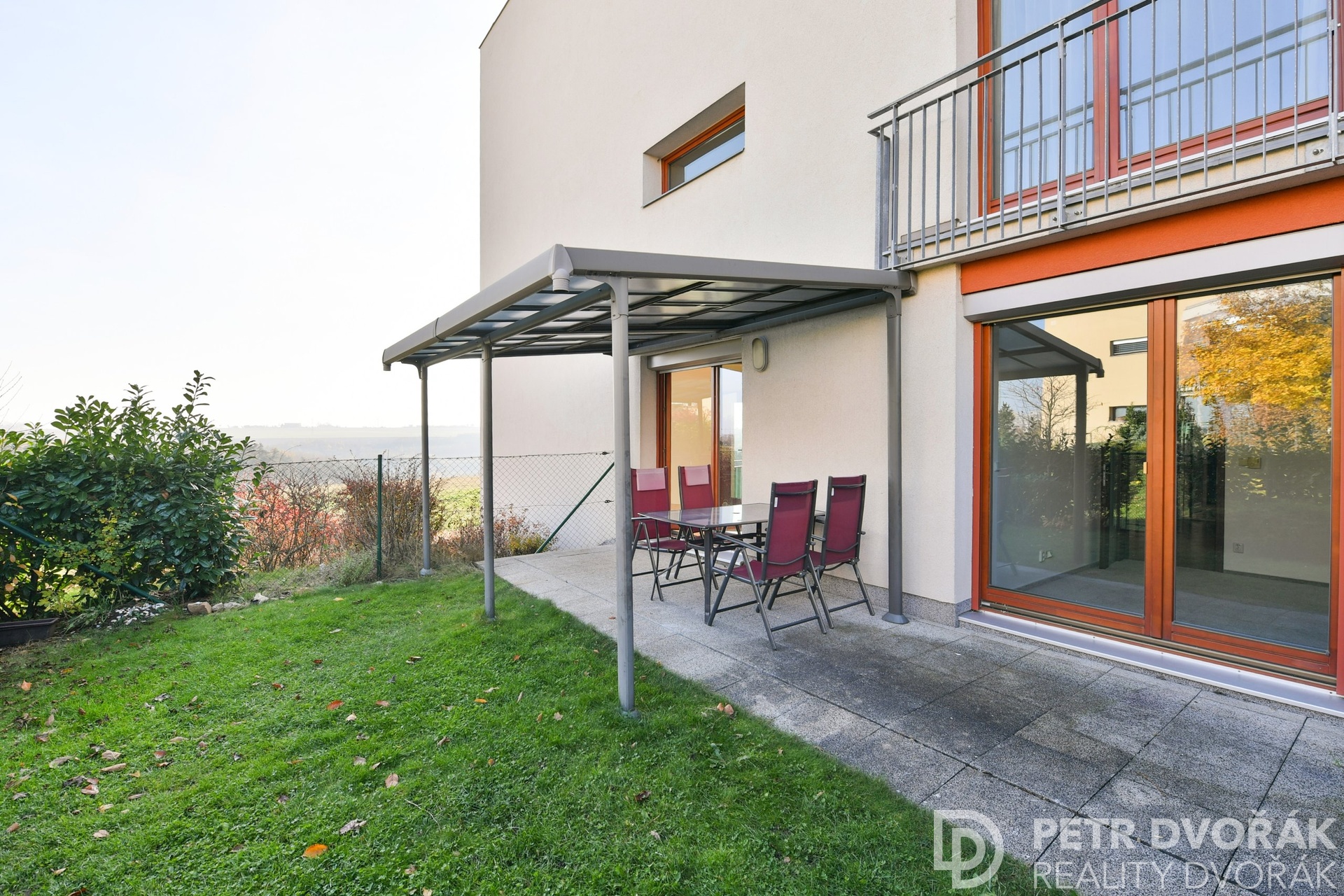 Dispozici tvoří prostorný obývací pokoj s kuchyní a přímým vstupem na balkon a předzahrádku se zastřešenou terasou, ložnice s přístupem na balkon, další samostatný pokoj, koupelna s vanou, toaleta pro hosty, šatna/komora a vstupní hala. Interiér je díky vysokým francouzským oknům orientovaným na východ, jih a západ prosvětlený a vzdušný, všechna okna jsou osazena venkovními elektrickými žaluziemi.