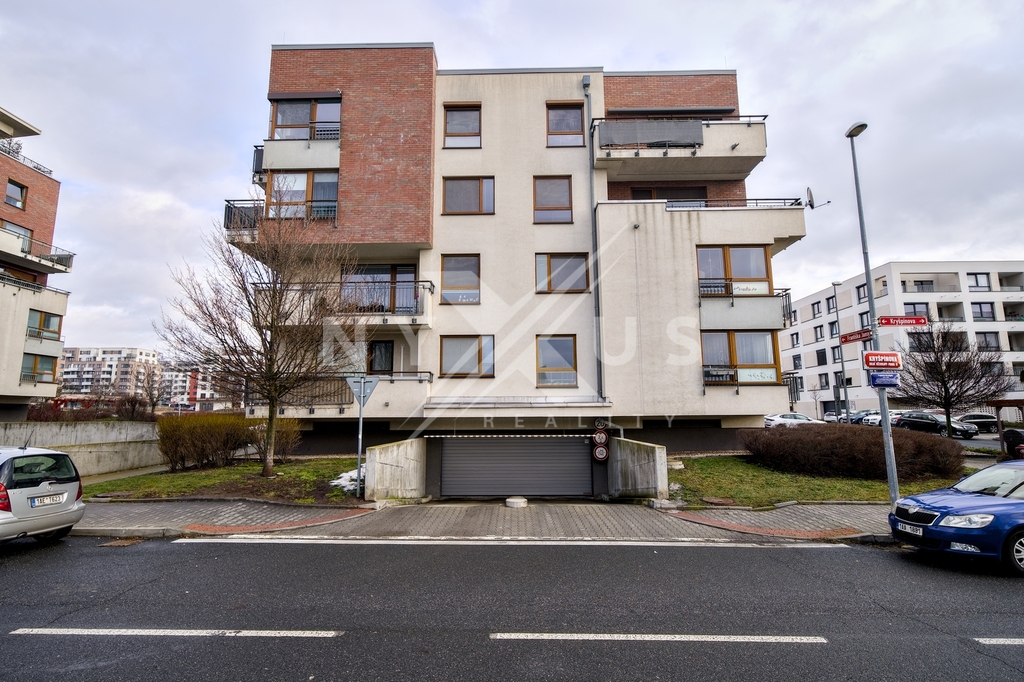 Interiér bytu je řešený chodbou, obývací částí s kuchyňským koutem ( k dispozici pouze varná deska a horkovzdušná trouba, lednice, myčka - není) a vstupem na lodžii, ložnicí, pokojem, koupelnou se sprchovým koutem a místem pro umístění pračky, samostatnou toaletou a komorou v bytě. K dispozici garážové stání již v ceně nájemného.