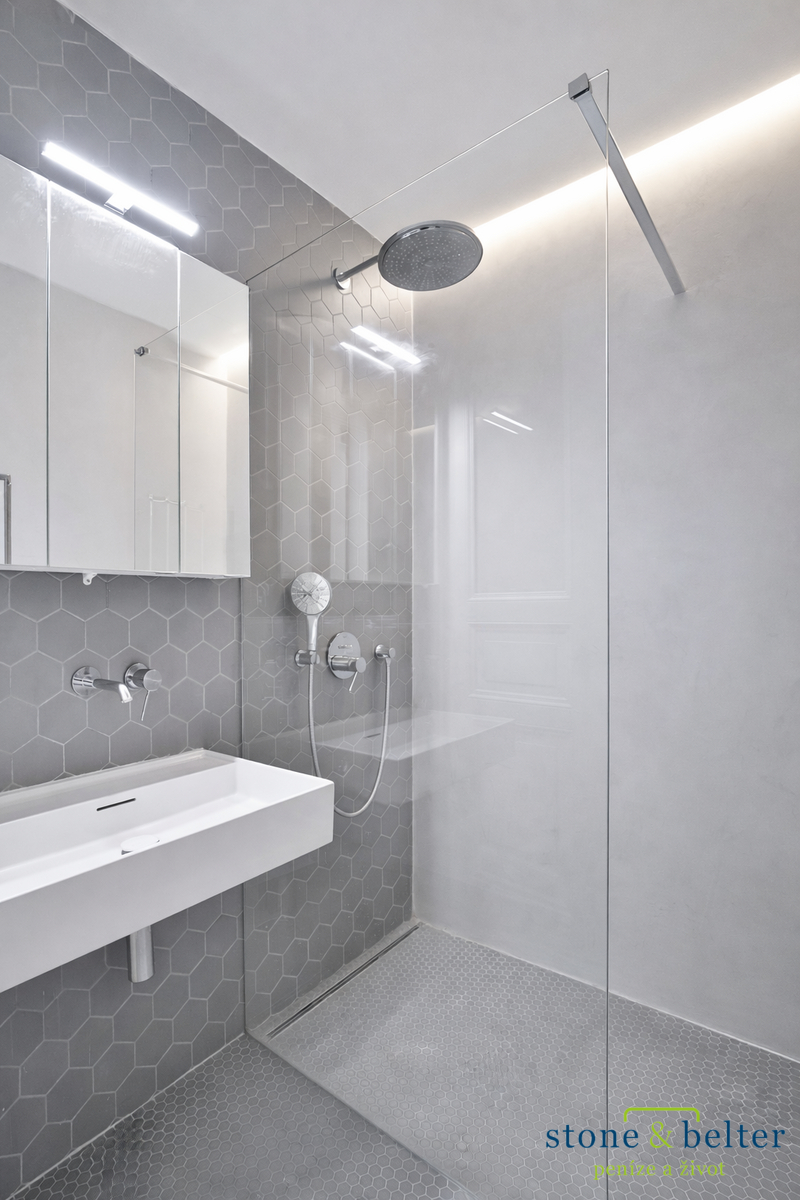 Nadstandardní vybavení a provedení, vysoké stropy, velká okna, parkety, dlažba, úložné prostory, elektrický kotel, pračka, indukční varná deska, myčka, společný balkon v mezipatře domu.