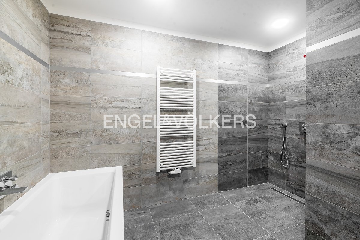 Kuchyňská linka je vybavena vestavěnými spotřebiči – lednicí s mrazákem, sklokeramickou varnou deskou, elektrickou i mikrovlnnou troubou, myčkou a digestoří. V koupelně je k dispozici vana, sprchový kout a topný žebřík. Vytápění zajišťuje elektrický kotel umístěný na toaletě. Podlahy jsou řešeny kombinací vinylové krytiny a keramické dlažby.