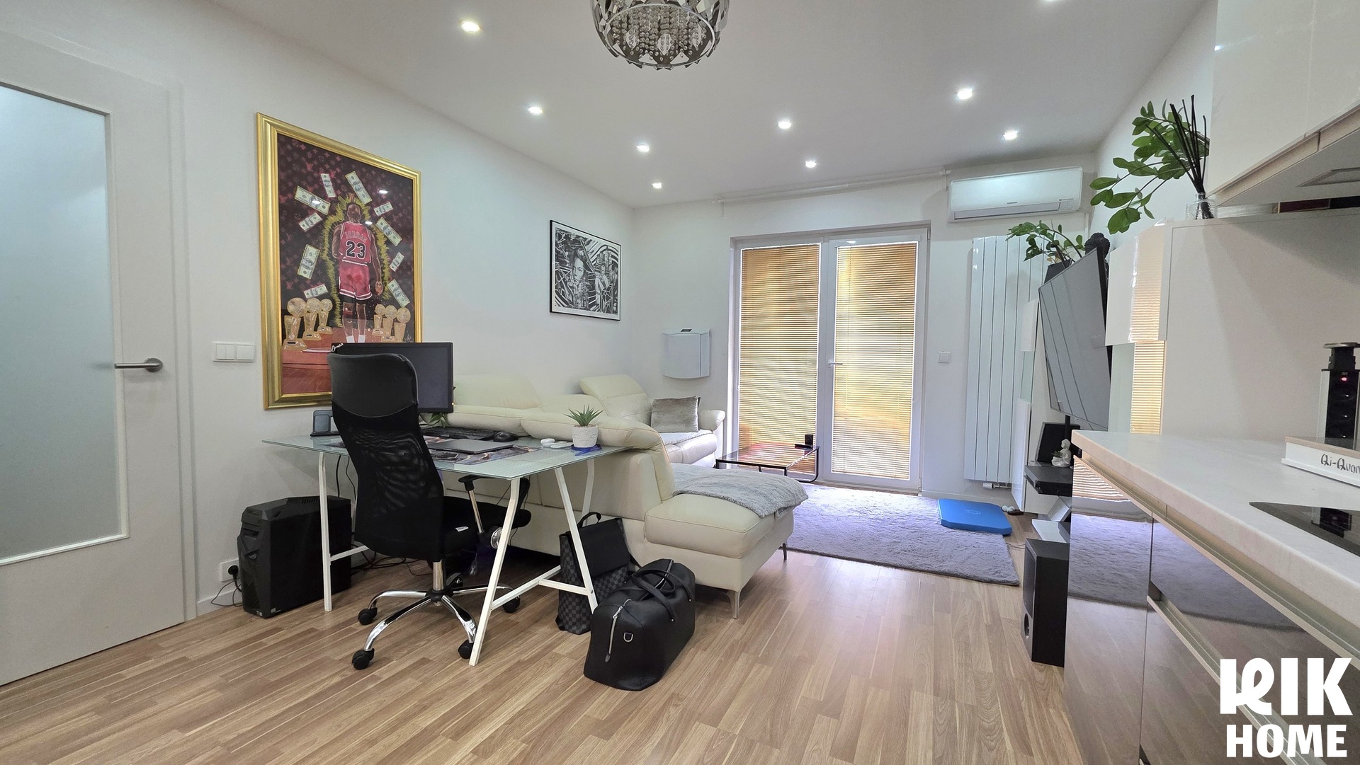 Mikroklimatické podmínky v bytě jsou řešeny pomocí prvotřídní klimatizační jednotky typu split a rekuperačních jednotek v každé místnosti. Díky této kombinaci v létě nemusíte větrat a přicházet o chladný vzduch, zatímco v zimě udržíte teplo uvnitř.