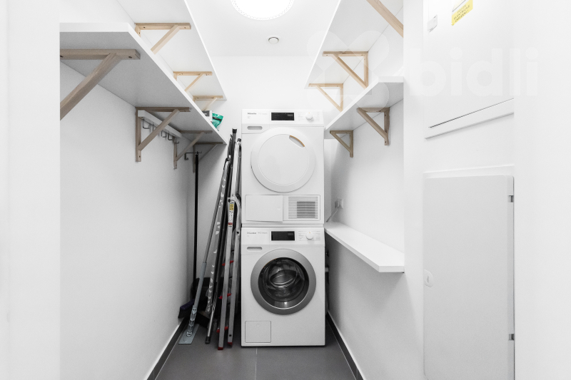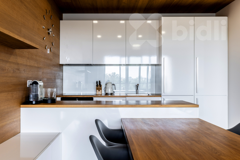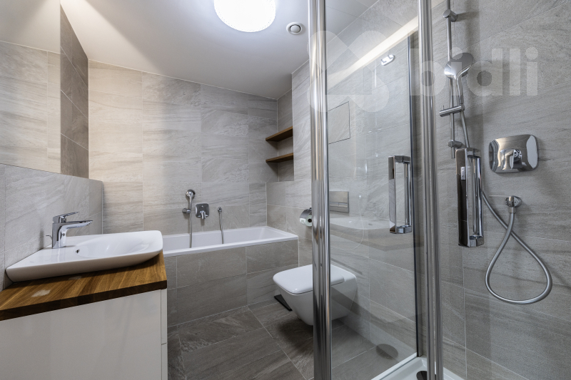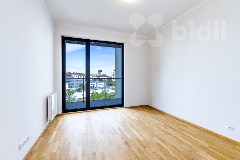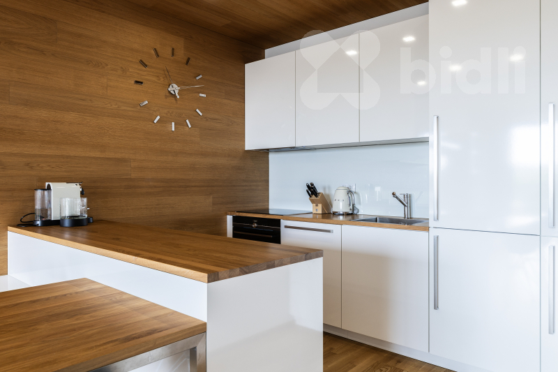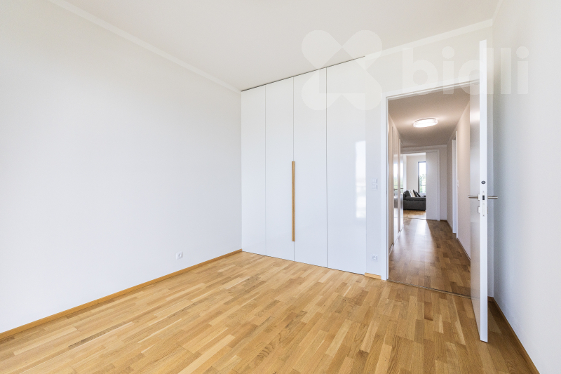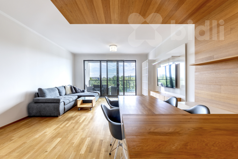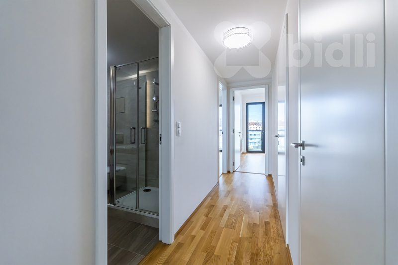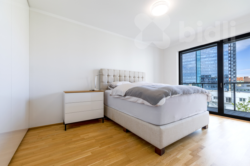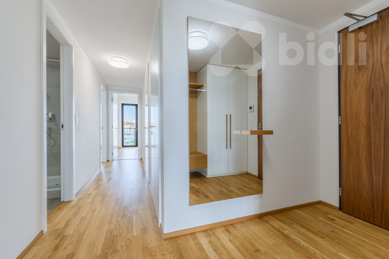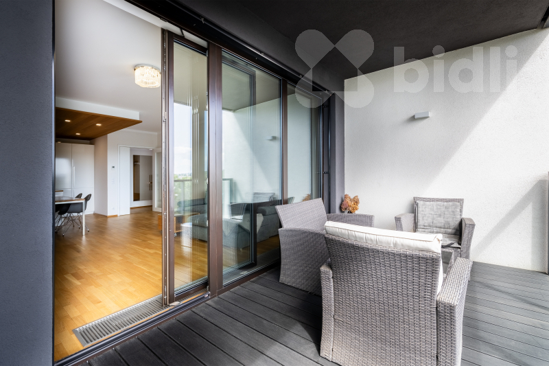 Celková plocha bytu je 97,1 m2 a jeho dispozice je tvořena obývacím pokojem se vstupem na prostorný balkon, sedací soupravu jídelní částí s kuchyňským koutem vybaveným spotřebiči značky Samsung - lednice, mrazák, myčka, varná deska, pečící trouba, odsavač par. V ložnici se nachází postel s vysokou matrací pro větší komfort na spaní a prostorná šatní skříň, ve druhé ložnici nalezneme prostornou šatnu a balkon, který je přístupný z obou pokojů. V koupelně je umístěná vana, sprchový kout a toaleta, další toaleta v bytě je samostatná. Prostorná komora kombinuje úložné prostory s technickou místností (pračka a sušička zn. Miele je součástí vybavení). Podlahy dřevěné z dubu a dlažba, velkoformátová 3-vrstvá okna (s automaticky stahovacími roletami při špatném počasí) dodávající bytu vzdušnost a příjemnou atmosféru.