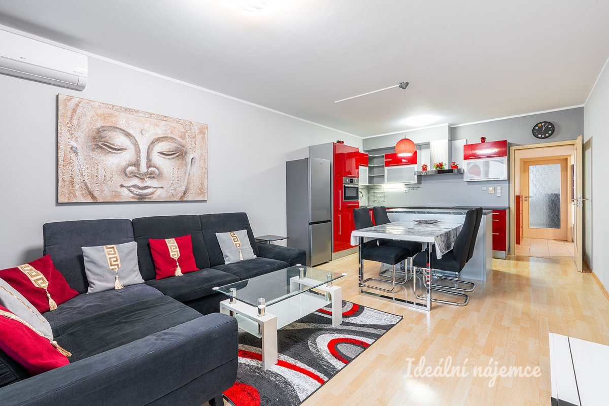 Interiér bytu je promyšleně rozdělen tak, aby poskytoval maximální komfort. Srdcem domova je prostorný a světlý obývací pokoj s jídelním koutem, na který navazuje moderní kuchyně. Ta je vybavena všemi potřebnými spotřebiči včetně myčky, elektrické i mikrovlnné trouby a praktického pracovního ostrůvku, který nabízí dostatek prostoru pro vaření i úložné prostory. Z obývací části je vstup na balkon, který vybízí k odpočinku. Další dva samostatné pokoje lze díky stávajícímu vybavení okamžitě využít jako ložnici, dětský pokoj nebo klidnou pracovnu. Moderní koupelna disponuje nadstandardně velkým sprchovým koutem a pračkou, přičemž toaleta je pro větší soukromí umístěna samostatně.