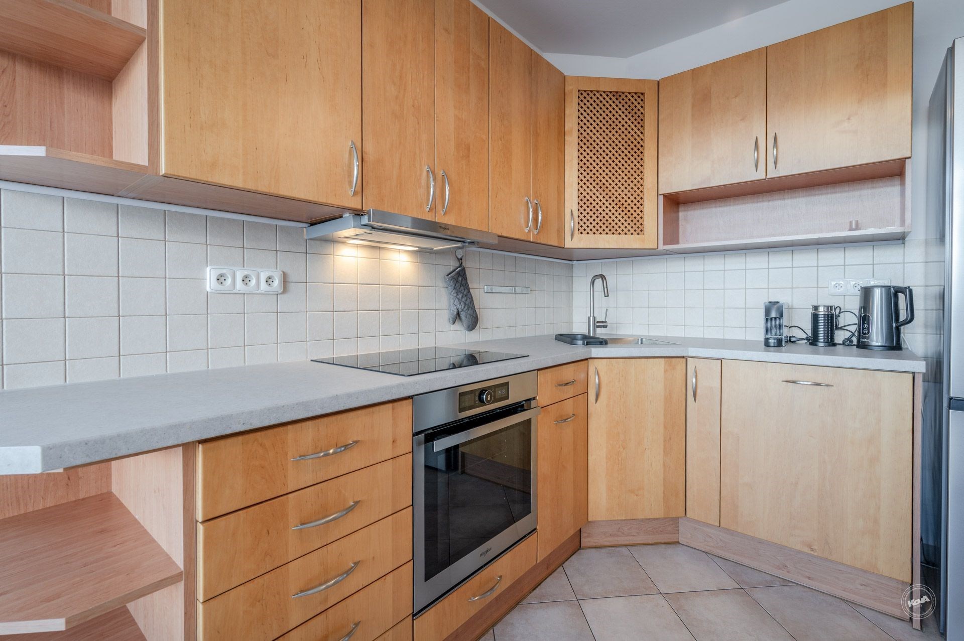 Kuchyňská linka je vybavena vestavěnými spotřebiči (trouba, varná deska, digestoř, lednice s mrazákem).