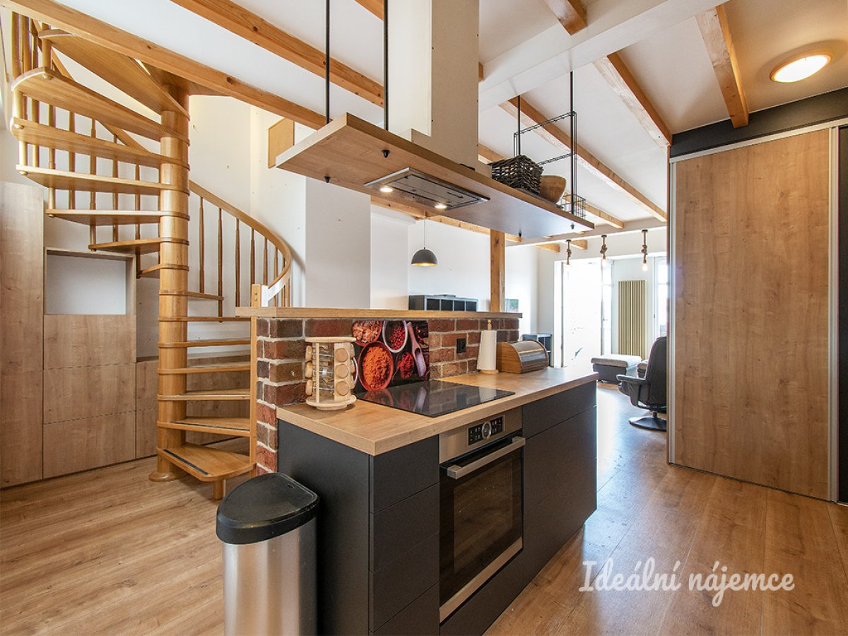 Naproti kuchyni jsou schody, které vedou do druhého patra. Pod a za schody jsou úložné prostory. Vedle kuchyně můžeme nalézt vstup do mezipatra, kde se nachází dětský pokoj a koupelna s toaletou. V druhém patře se nachází pracovní stůl s židlí, druhá koupelna s pračkou a ložnicí. Součástí ložnice je i knihovna a prostorná šatna. Po celém bytě jsou dřevěné a laminátové podlahy a klimatizace. Na oknech jsou elektrické rolety.