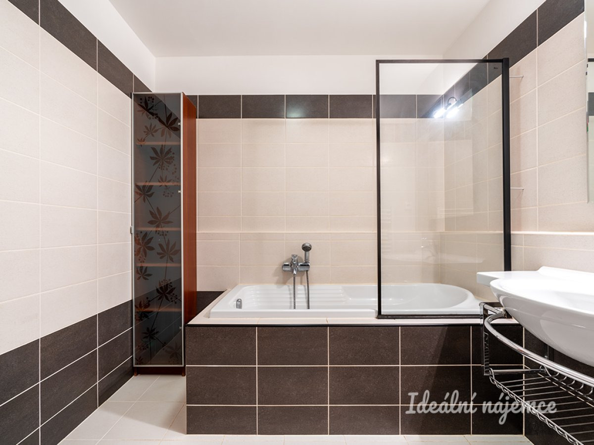 Vkusně řešená prostorná koupelna s vanou se sprchovou zástěnou, toaleta je samostatná.