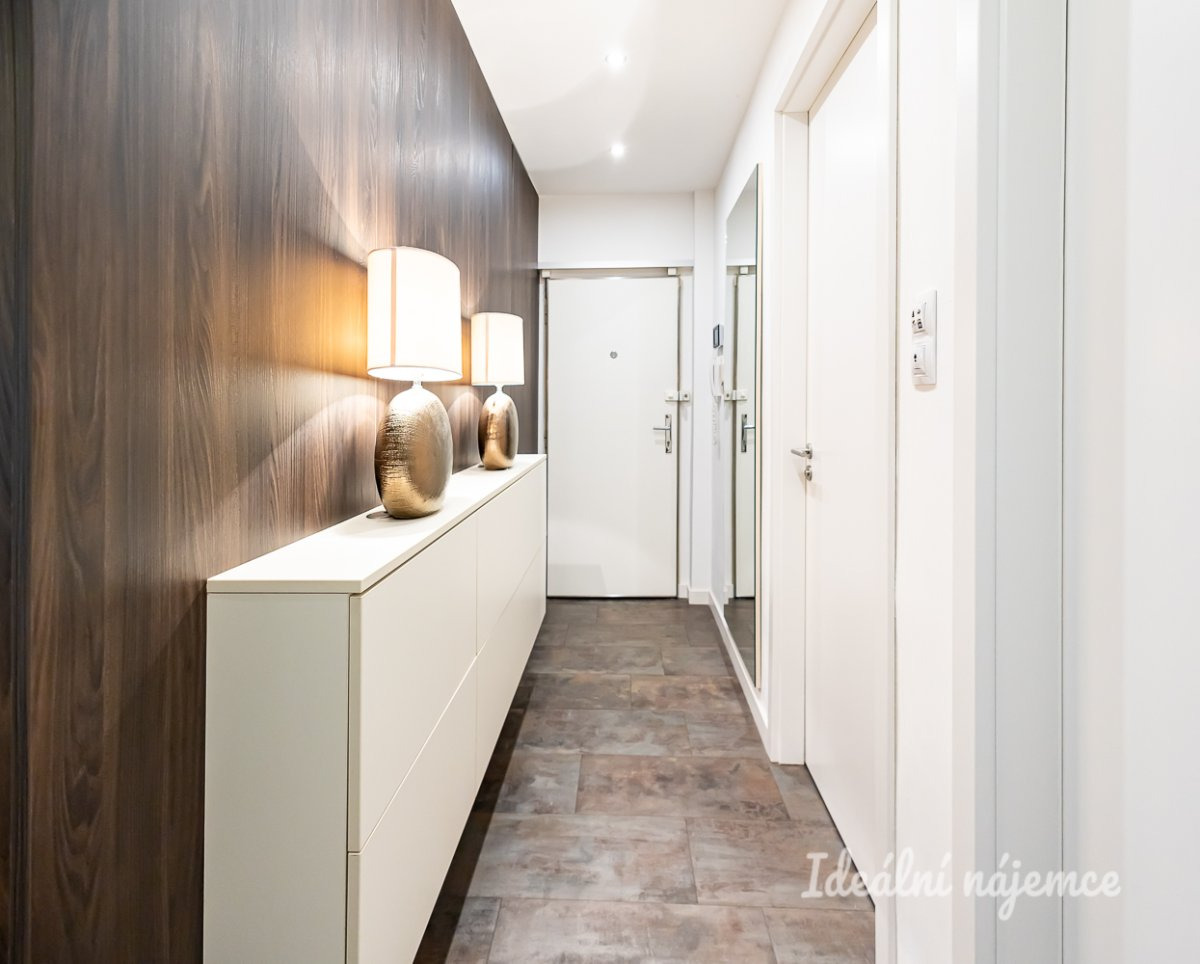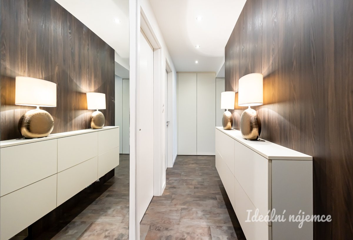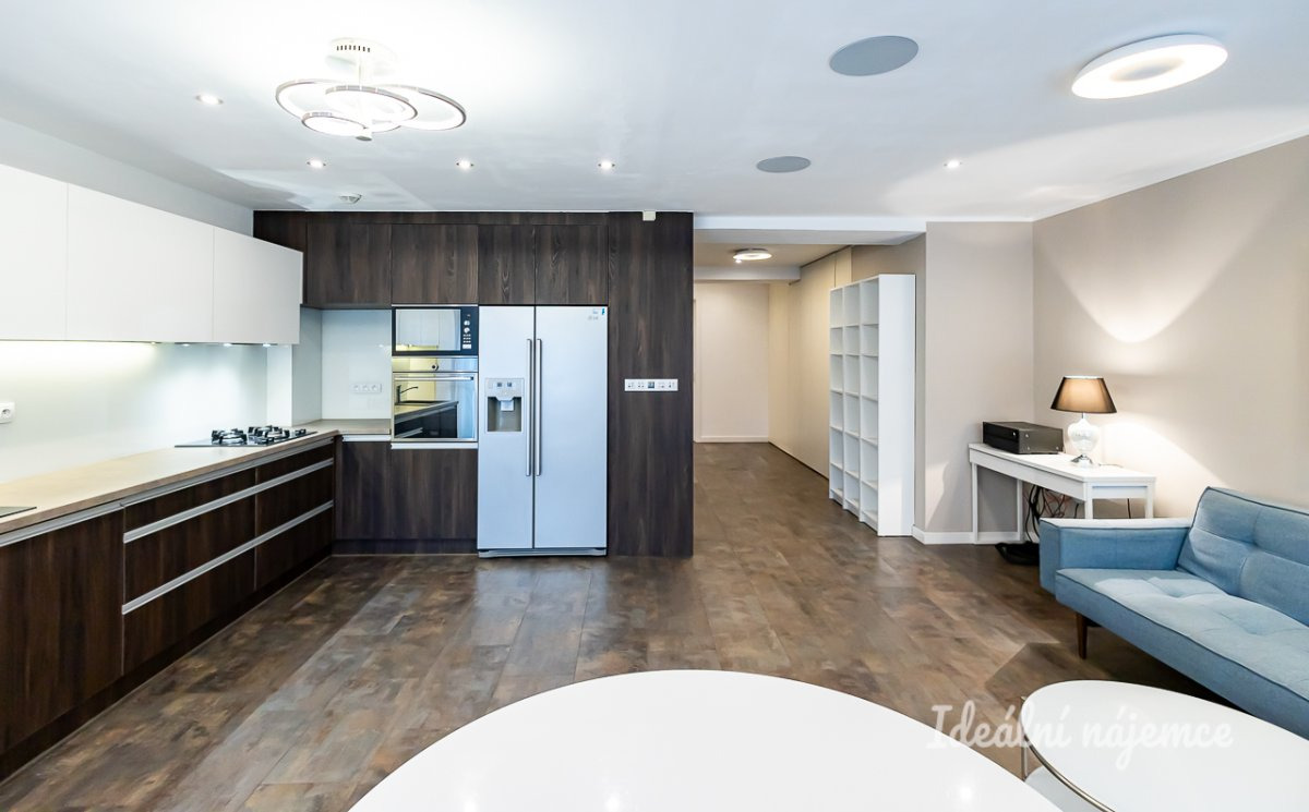 Byt prošel zdařilou rekonstrukcí a nabízí se částečně vybavený kvalitním nábytkem, designovými svítidly a komfortními elektronickými doplňky: klimatizace, televize, AV receiver, vestavné podhledové reproduktory, chytré osvětlení, alarm, intercom. Ve všech místnostech jsou k dispozici již propojené a spolehlivé datové zásuvky LAN a rozvody kabelové TV. Na bytě je zavedeno internetové připojení o rychlosti 500 Mb/s, včetně základních programů kabelové televize. Byt je pokryt kvalitním wi-fi signálem.