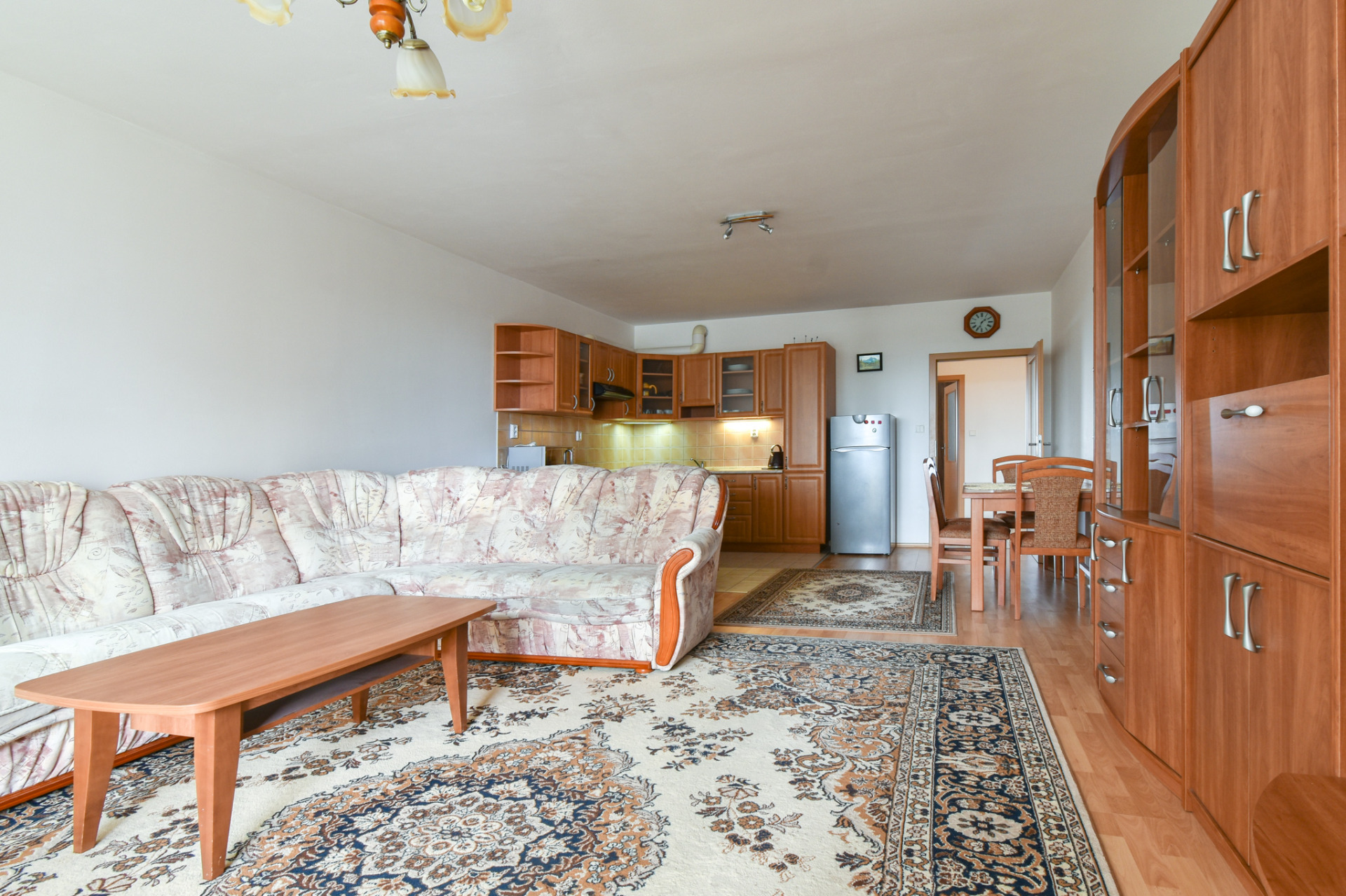 Byt se nabízí plně vybavený. Kuchyňská linka disponuje lednicí, mrazákem, sklo-keramická deska, digestoří, mikrovlnou troubou a horkovzdušnou troubou. V obývací části najdeme stůl s židlemi, velkou pohovku, křeslo, konferenční stolek, televizí a obývací stěnu. Ložnice disponuje velkou manželskou postelí a skříní. V pokoji je skříň a spousta úložného prostoru. Koupelna je zařízená vanou a umyvadlem se zrcadlem. Garážové stání je po dohodě.