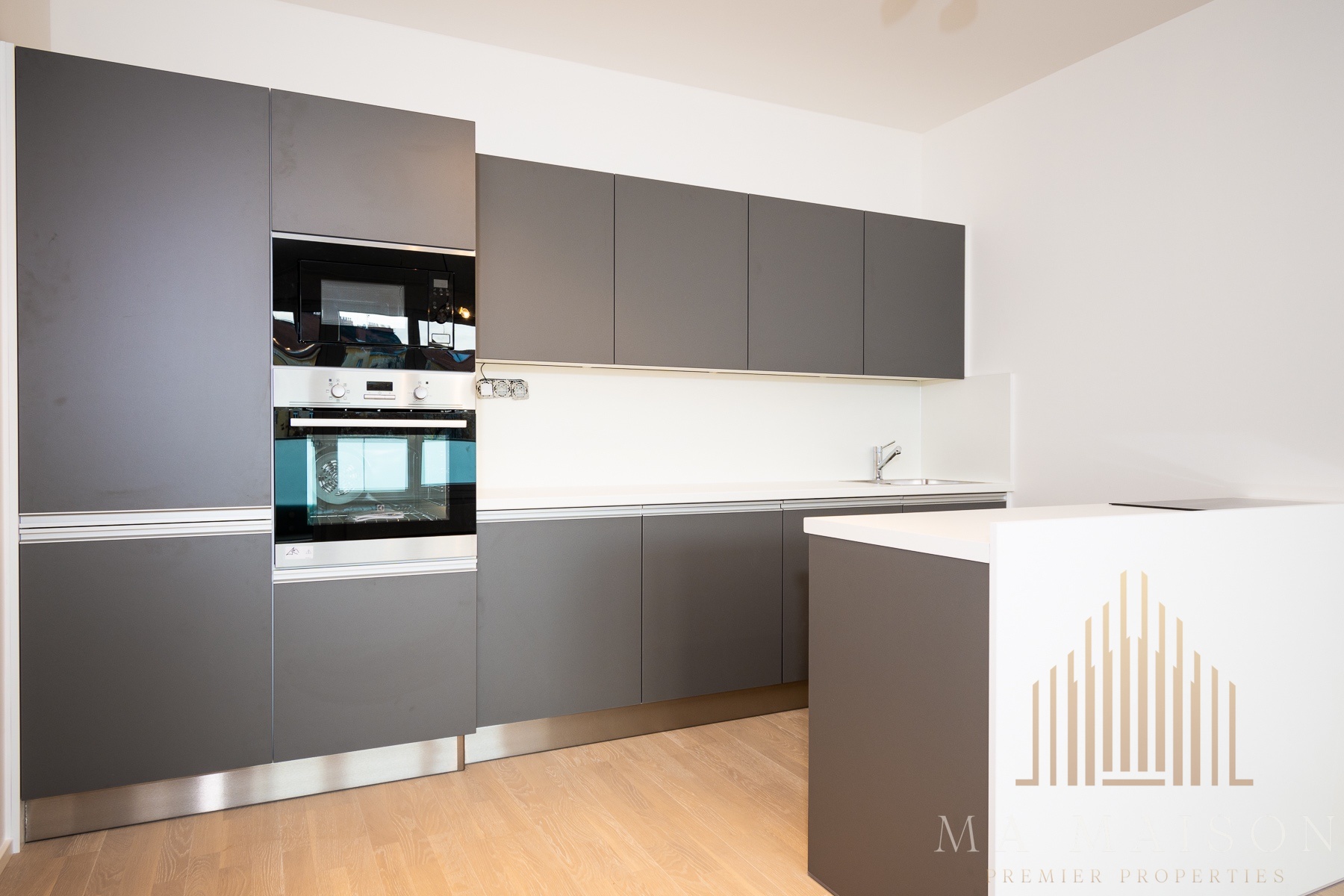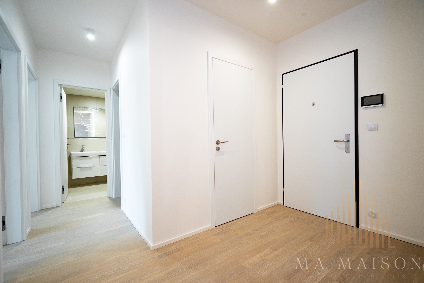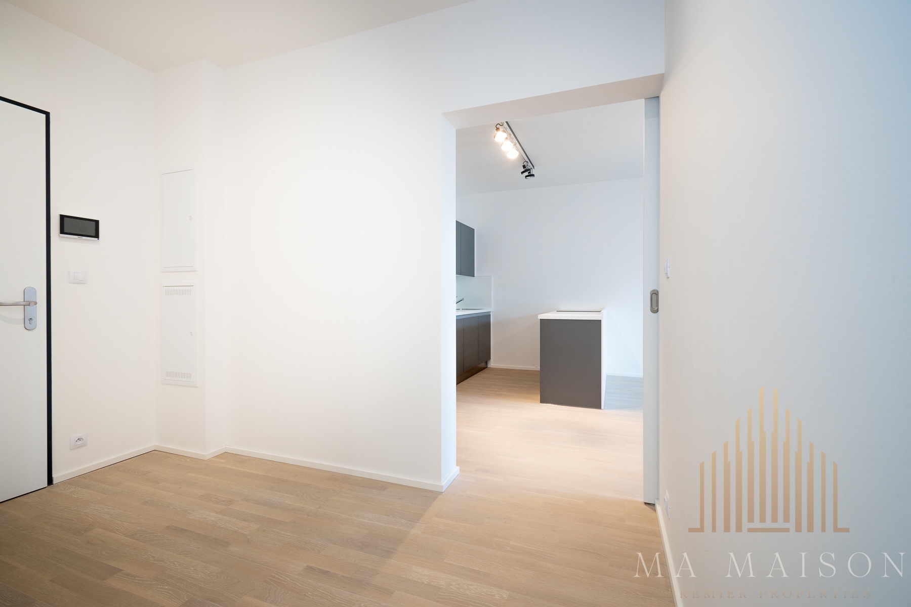 Byt se nabízí jako nezařízený a sestává ze vstupní předsíně, komory, koupelny, toalety, obývací části, která je spojená s kuchyní a dvěmi dalšími pokoji. Součástí obývací místnosti je kuchyňská linka, která je vybavená lednicí s mrazákem, varnou deskou, troubou, mikrovlnnou troubou a myčkou. Všechny spotřebiče jsou zn. Electrolux. Linka je rozdělena do dvou částí, kdy část, kde se nachází varná deska, je na samostatném baru. Zároveň linka nabízí spoustu úložného prostoru.