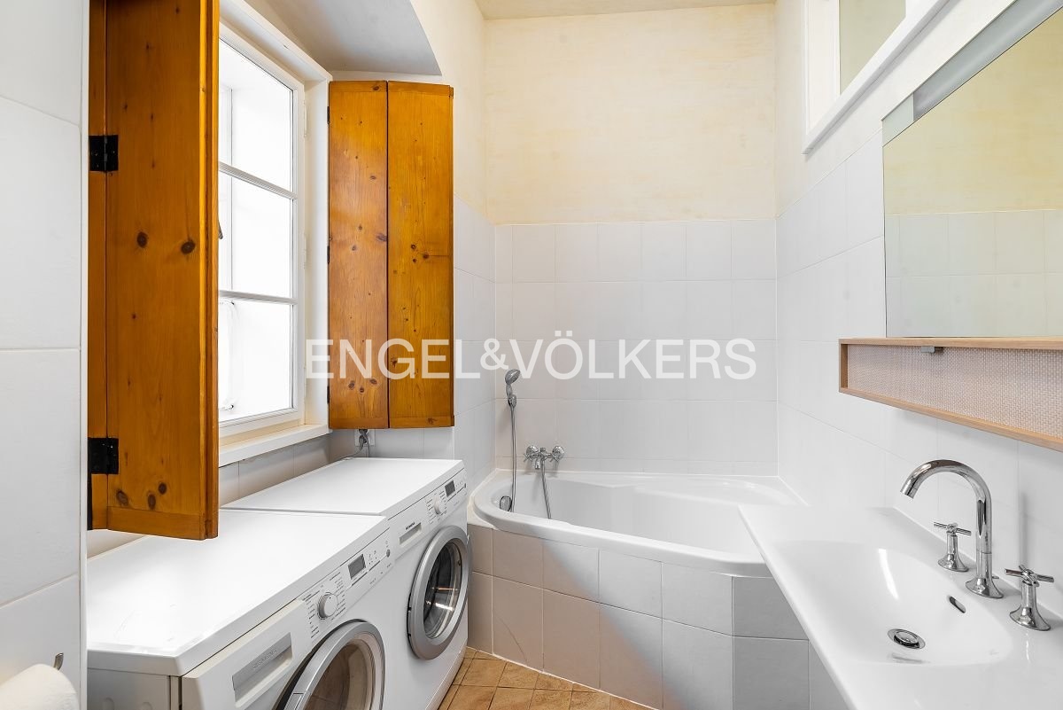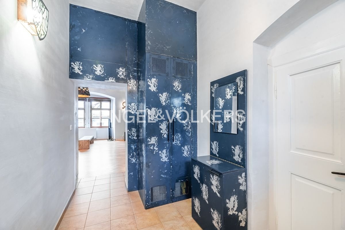 Při nákladné rekonstrukci se dbalo na zachování původních prvků jako například gotické verze štuků. Byt se skládá z prostorné centrální haly vyzdobené motivy klasického českého lva z dílny Martina Ceplechy, ze které se jde do koupelny s vanou a do první menší ložnice. Koupelna je vybavena pračkou a sušičkou. Obývací část s jídelnou je velmi vzdušná a prostorná a nabízí unikátní výhledy na historickou Prahu. Kuchyňský kout je kompletně vybaven všemi spotřebiči jako je myčka, elektrická trouba s varnou deskou a digestoří, lednička, mrazák. V ložnici je efektivně vyřešen úložný prostor formou zabudovaných skříní. K bytu náleží sklep a menší lodžie. V domě je výtah.