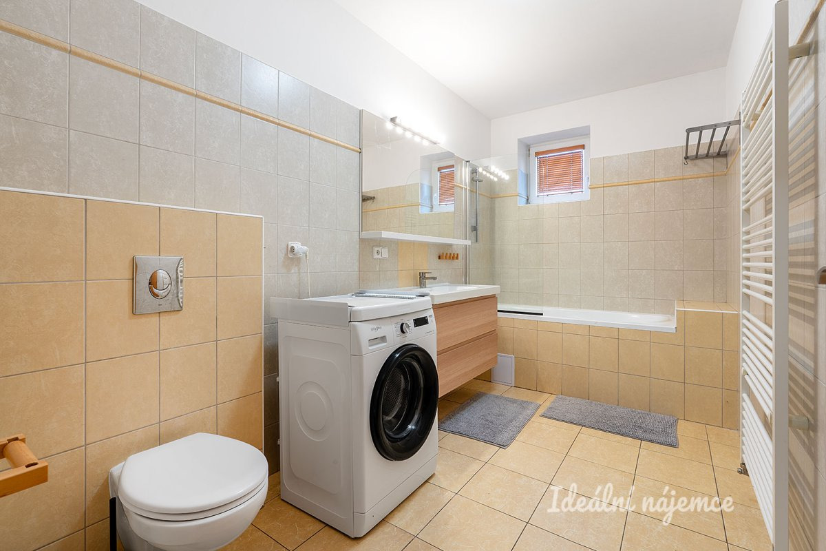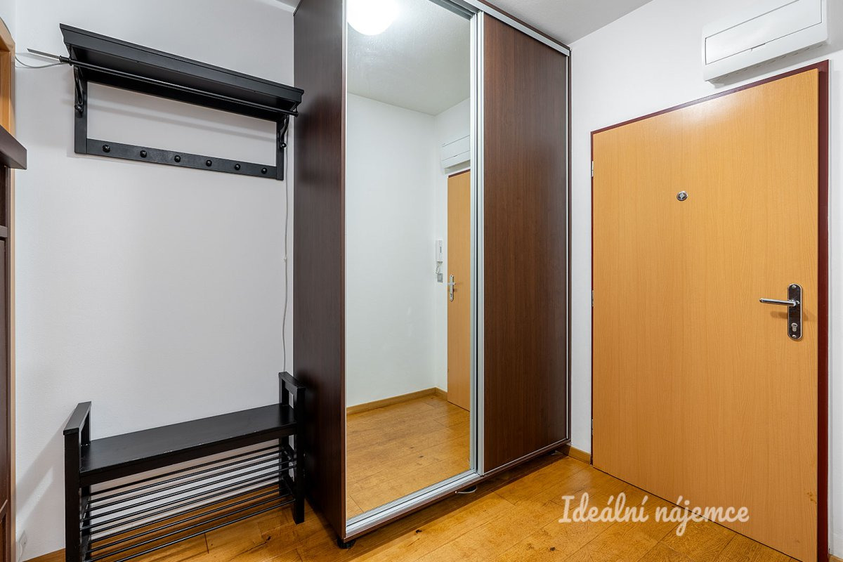 Byt má dále dva samostatné pokoje. Jeden je světlý, s oknem, aktuálně vybavený patrovou postelí, dvojicí pracovních stolů, knihovnami a dostatkem úložných prostor. Druhý pokoj, přístupný přes posuvné dveře z obývacího pokoje, slouží jako klidová ložnice – je tichý a nabízí pohodlné spaní i vestavěné úložné prostory. Samostatná šatna výrazně pomáhá udržet byt vzdušný a přehledný. Předsíň je vybavena skříní, botníkem a věšákem, takže odkládání oděvů a obuvi je pohodlné. Koupelna působí prostorně – kromě vany, umyvadla a zrcadla zde najdete praktickou koupelnovou skříňku, pračku a toaletu.